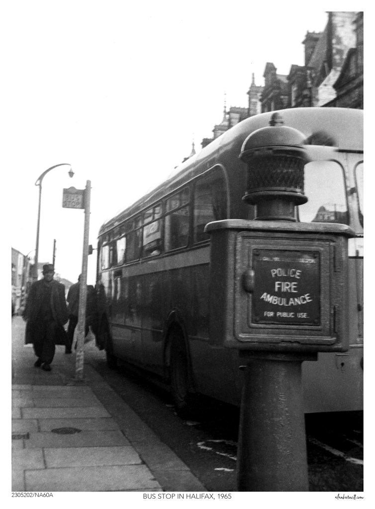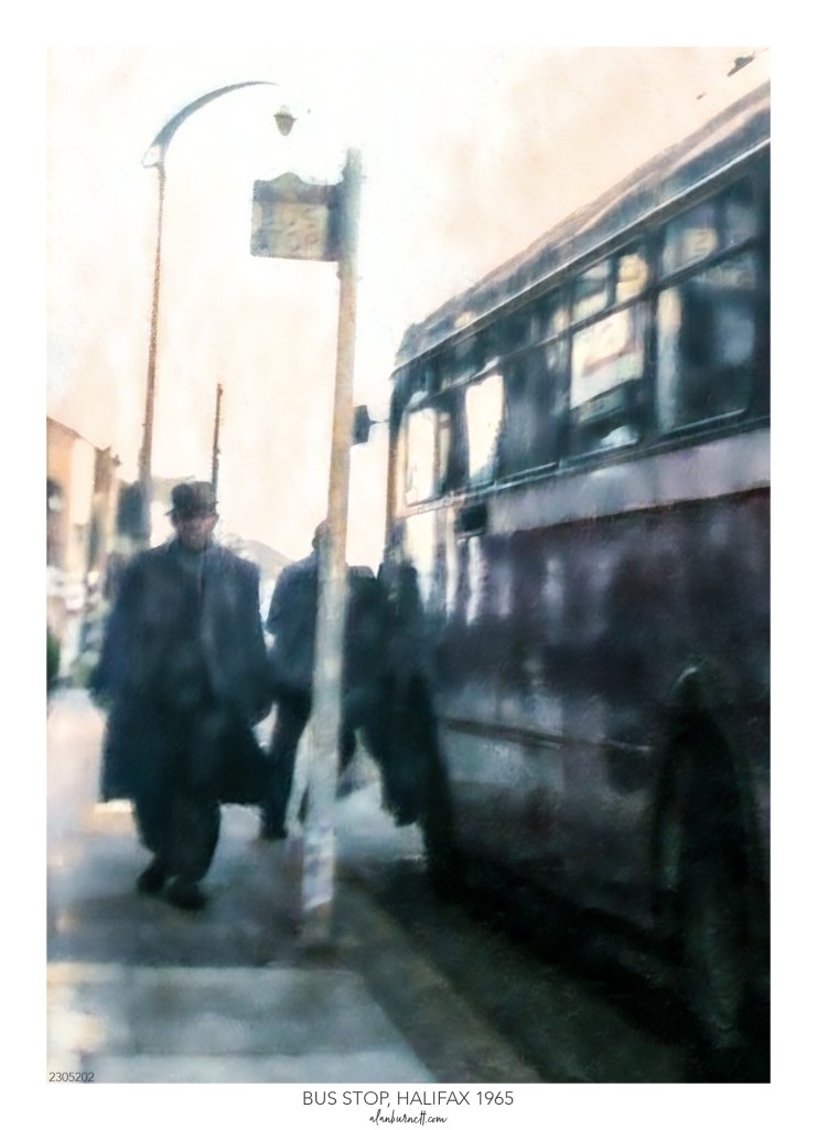 I received an invitation to give Adobe Firefly – their new Artificial Intelligence generated creative system – a try, and at the same time I was trying to work out what to do with a rather tired old photograph I took almost sixty years ago. The photograph was taken in Halifax and shows a bus at a bus stop, with a man walking down the street having just got off the bus.
