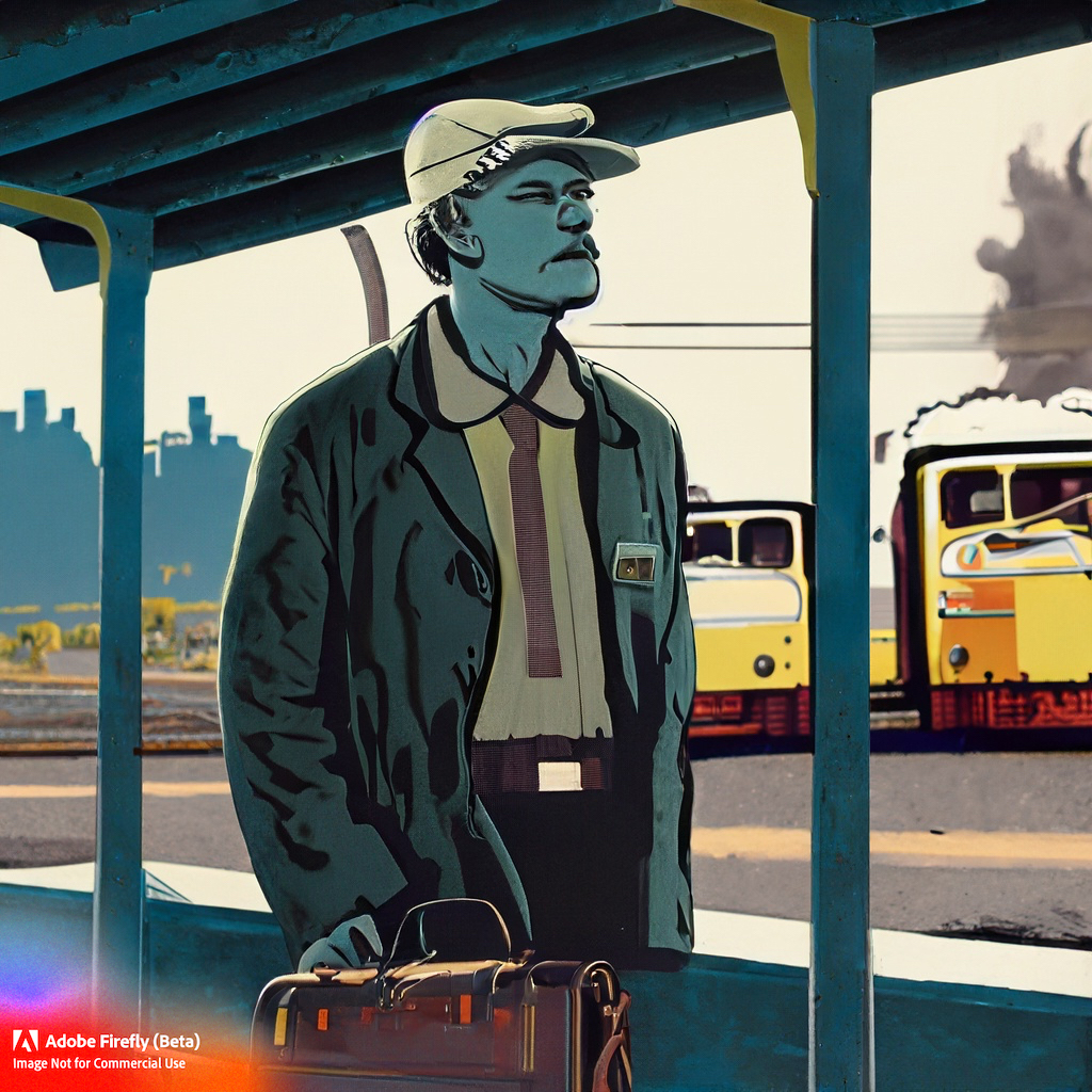 For whatever reason, the sight of a man at a bus stop stimulated my attempts at creativity all those years ago (with, I must confess, debatable results), so I decided to issue a similar challenge to the very best in twenty-first century Artificial Intelligence. I therefore instructed Adobe Firefly to create an image of “a man at a bus stop in 1960s industrial landscape”. Here is what it came up with –