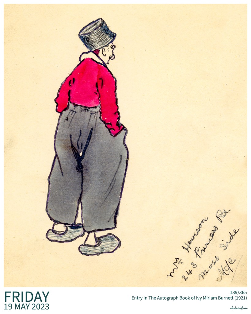 When she was 13 years old in March 1920, my fathers’ cousin, Ivy Miriam Burnett, was given an autograph book. It is full of those little poems – some silly, some uplifting – that have populated such books over the years. It also contains a number of drawings; this one contributed by Mrs Hewison of Moss Side, Manchester.