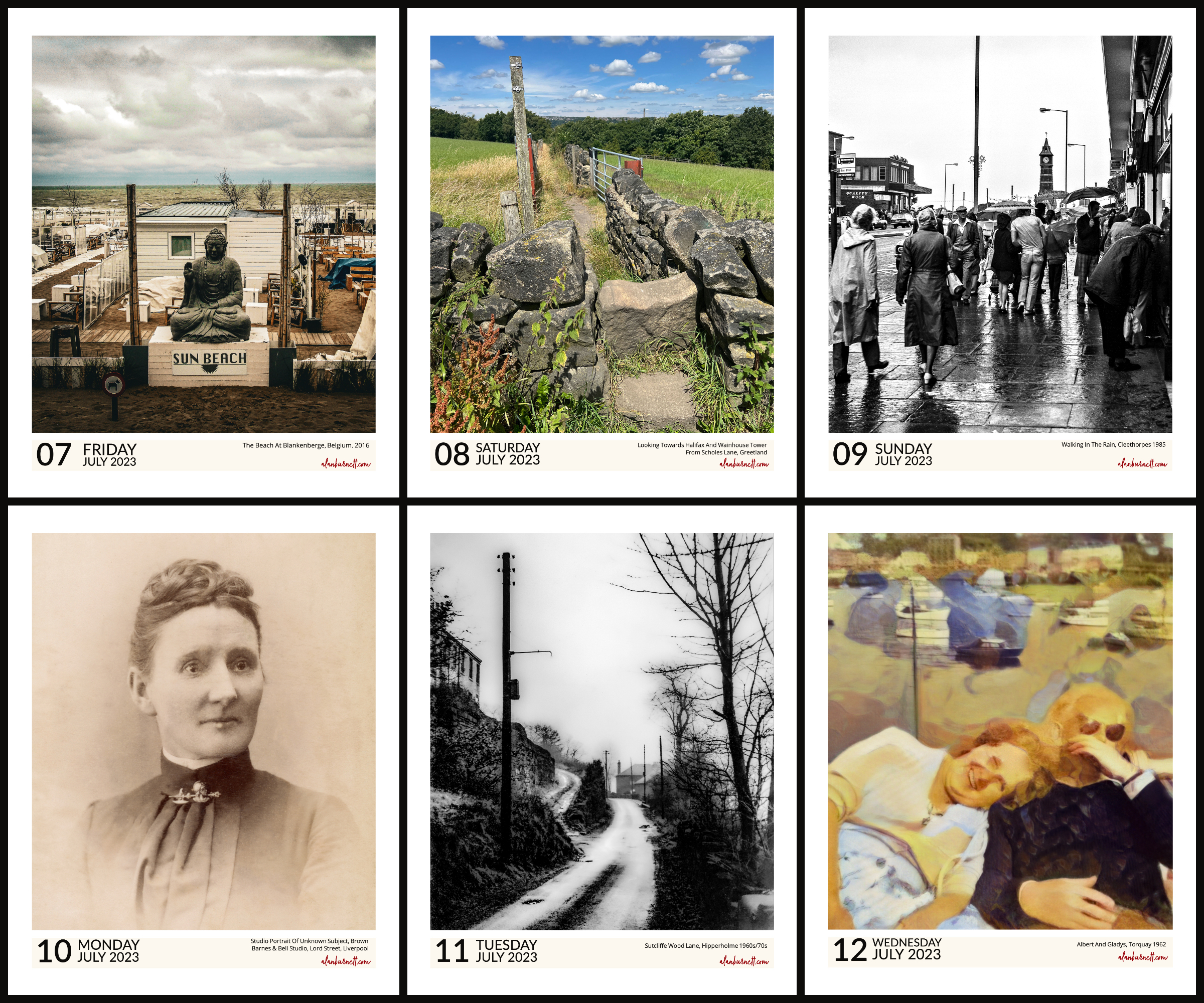 I took this photograph in Belgium a few years ago when I was doing a thing on “photographic oxymorons”. Not even the intervention of a spiritual deity could bring about a transformation to the chilly waters of the English Channel.Stones that have soaked up their fill of hard work, paths that are squeezed like luxuries between fields, valleys that hide a world of roads, railways, rivers and canals, and a mill chimney tower that proudly proclaims – This Is Halifax.Walking In The Rain, Cleethorpes 1985: You can’t really do rain in colour – it’s a grey thing. Monochrome umbrellas and monochrome plastic rain hoods. Black and white reflections from wet paving stones.I’ve no idea who this lady is. All I know is that 130 years or so ago she went into the Liverpool studio of Messrs Brown, Barnes and Bell in Lord Street, Liverpool to have her likeness captured. I’m the current keeper of that likeness – having bought it for 50 pence on E-Bay – and I am sharing it with the world.This is a scan of a rather poor quality print of mine from way back when. Way back when the World Wide Web was constructed from telegraph poles and telephone wires.The negative that this is taken from was not just old and scratched but had also been attacked by some kind of image-eating fungus. So I daubed on every Photoshop filter I could find. The extraordinary thing is that my parents shine through the years – and the filters – and I am taken straight back to when I took the photograph over sixty years ago.