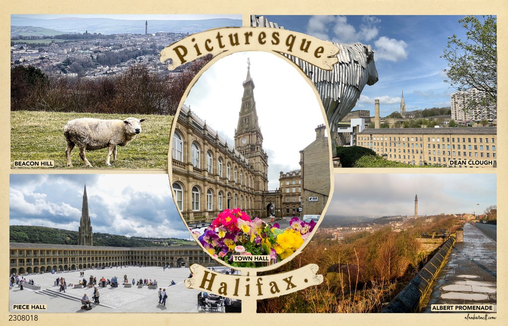This picture postcard dates from 1918 and is entitled “Picturesque Halifax” although I am not convinced the five photographs live up to that billing. Maybe it is the sepia patina, maybe it is changing perceptions of what is “picturesque”, I find it difficult, however, to get excited by Cote Hill or Ogden Reservoir. To celebrate Yorkshire Day, I have tried to update the card to feature my five illustrations of picturesque Halifax. Here is the final version, along with the five individual views.