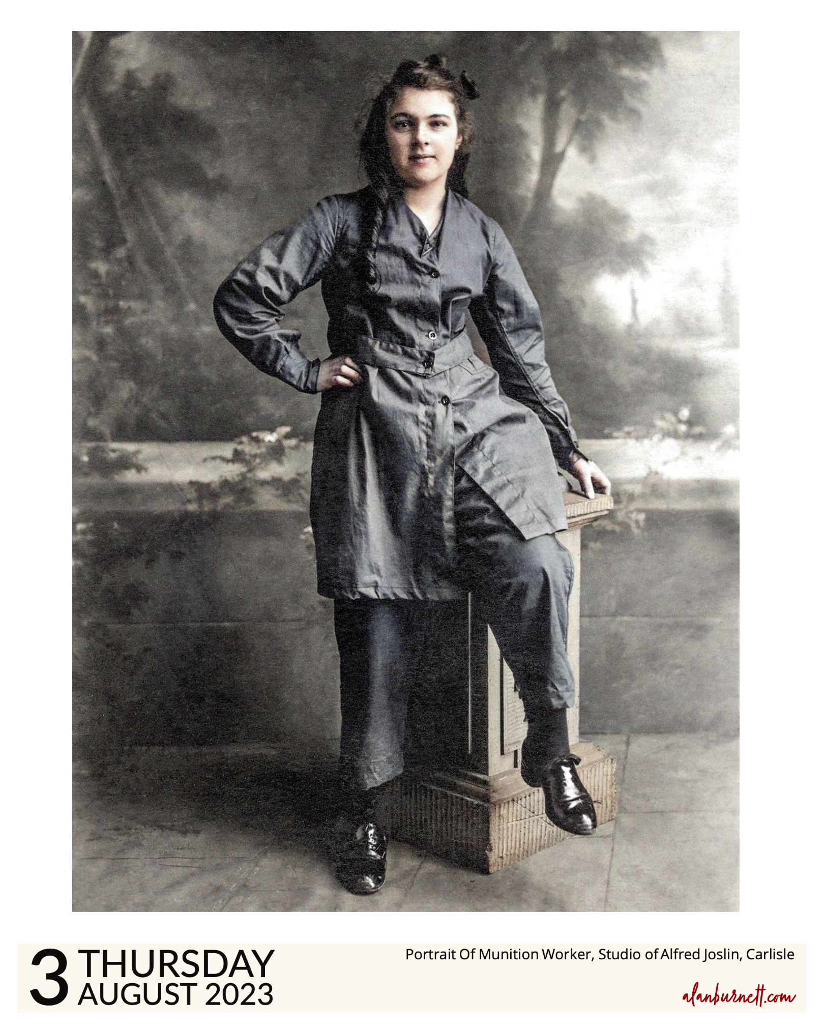 You can never be sure with found photographs. The only thing we can be sure about with this old photograph is that it comes from the photographic studio of Alfred Joslin of Bank Street, Carlisle. Joslin was active around the time of the First World War, and the clothing of this young lady suggests that she might have been a factory worker. There were a large number of important munition factories in the area around Carlisle in the early part of the twentieth century. So this young lady might have been a munitions worker. You can never be sure with found photos – but you can have a good guess.