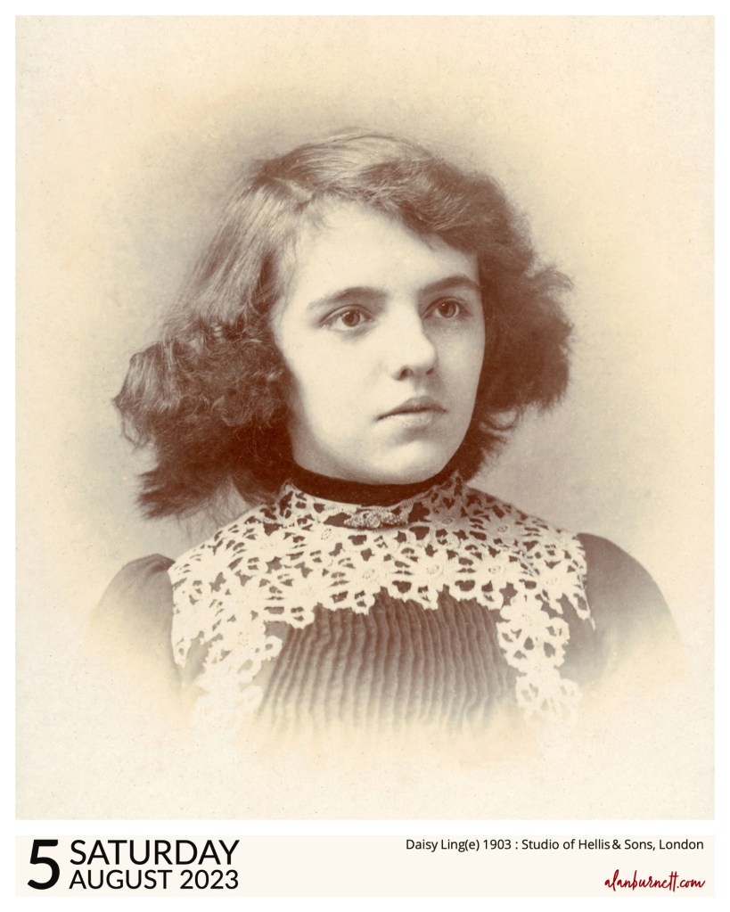 An Edwardian studio portrait bought for a few pence off a market stall. There’s a name on the back which is either Daisy Ling or Daisy Linge (it’s unclear) along with a date 1903 and an age (15). If it’s Daisy Ling, the 1911 census tells us, she went on to become a barmaid at the Boleyn Tavern in the East End of London. If it is Linge with an “e” she went on to become a schoolteacher and emigrated to Canada. Which do you think it is?