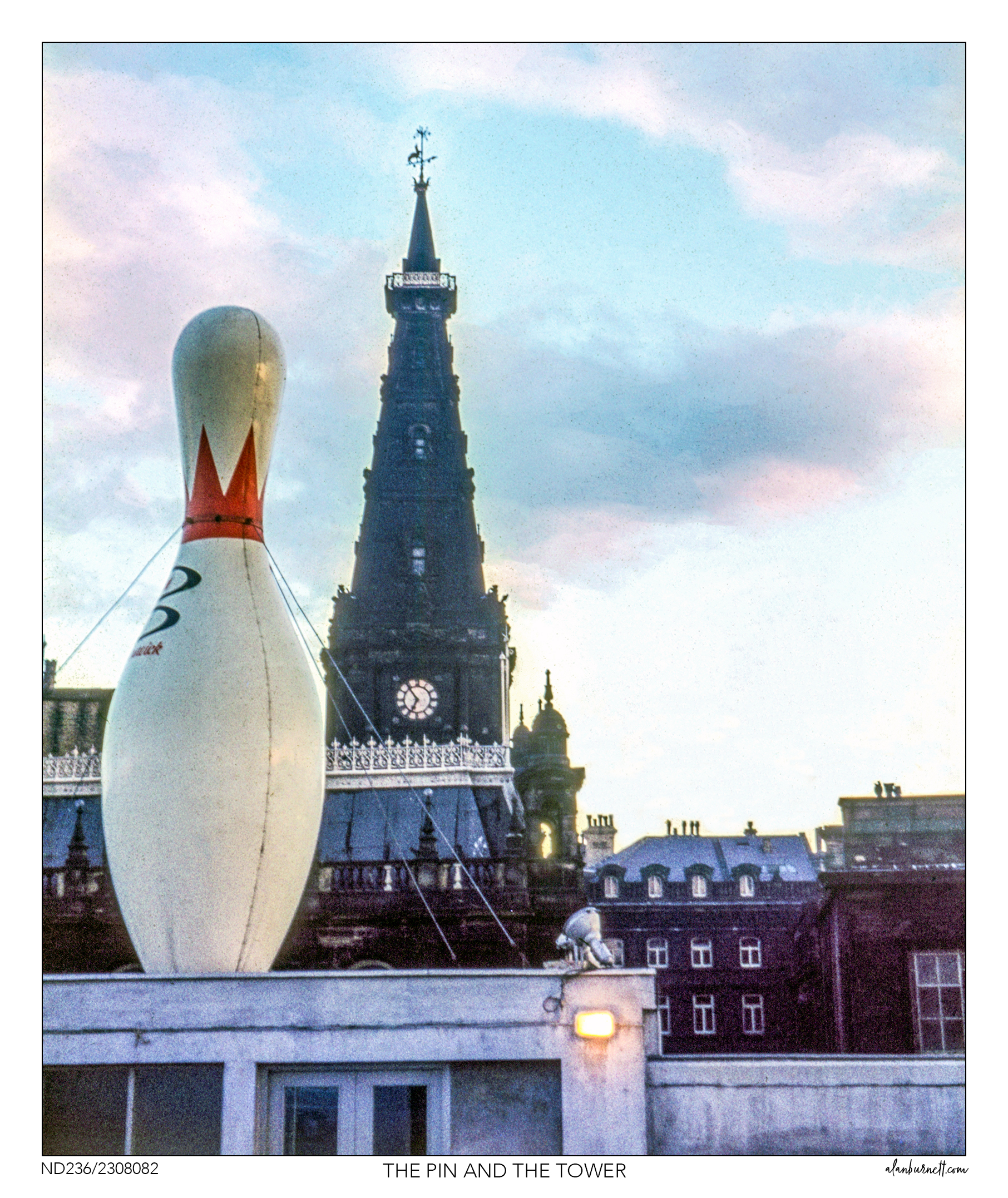 Halifax Bowl was part of the ten-pin bowling boom of the early 1960s. The first ten-pin bowling alley came to Britain from America in 1960, and by 1964 there were over 100 gleaming new bowling alleys in towns across the country. Halifax’s contribution to this craze was opened in February 1964 by the Coronation Street actress Pat Phoenix, and boasted 28 bowling lanes in addition to its giant plastic bowling pin. Local councillors, concerned that such a “shabby totem of an exclamation mark” might cast a cultural shadow over their neighbouring council chamber, granted permission for it to remain in place for just six months, and at the end of that period refused to give it a stay of execution.