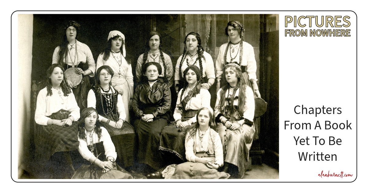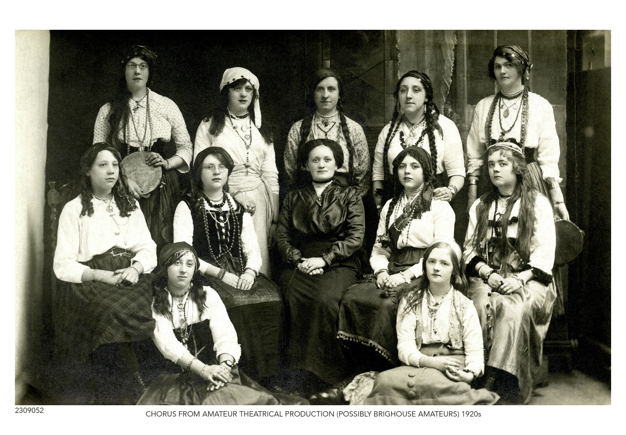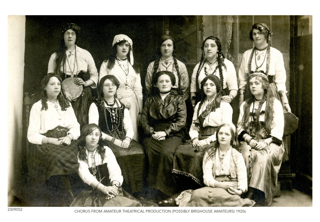 This group of young ladies, in what can only be described as eccentric dress, comes from a batch of photographs I bought several years ago which also contained some photographs of performances by the Brighouse Amateur Theatrical Society. We can therefore surmise that these fine ladies were the chorus from some Brighouse amateur theatrical production from the 1920s, but I would be loath to take a guess as to which one. The costumes are magnificent and look as though they were lovingly made from a set of Victorian dining-room curtains. As with so many old photographs, the individual faces are like chapters from a book yet to be written.