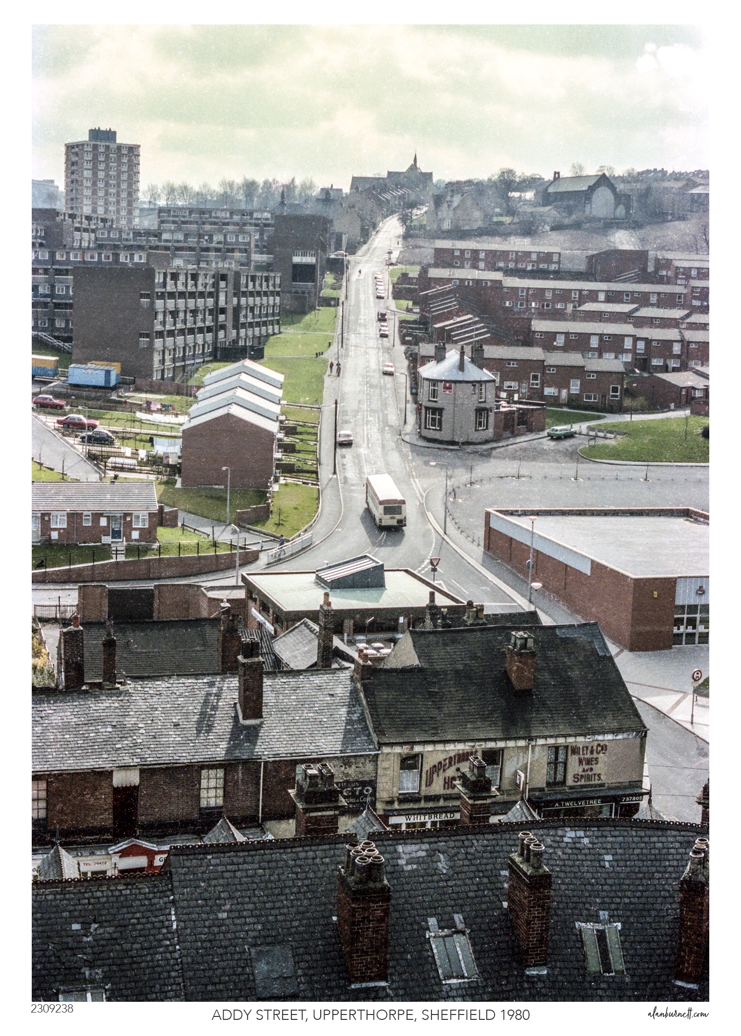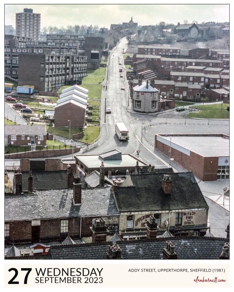 I must have taken this photograph from high up in one of the block of flats in Upperthorpe, Sheffield, forty-odd years ago. Back in those days I couldn’t pass a block of flats – and there were many to choose from in Sheffield in the 70s and 80s – without climbing the concrete stairs to find a good photographic viewpoint. These days, many of the high-rise blocks have gone, and I’m getting too old to do all that climbing. I suppose I could get a drone!
