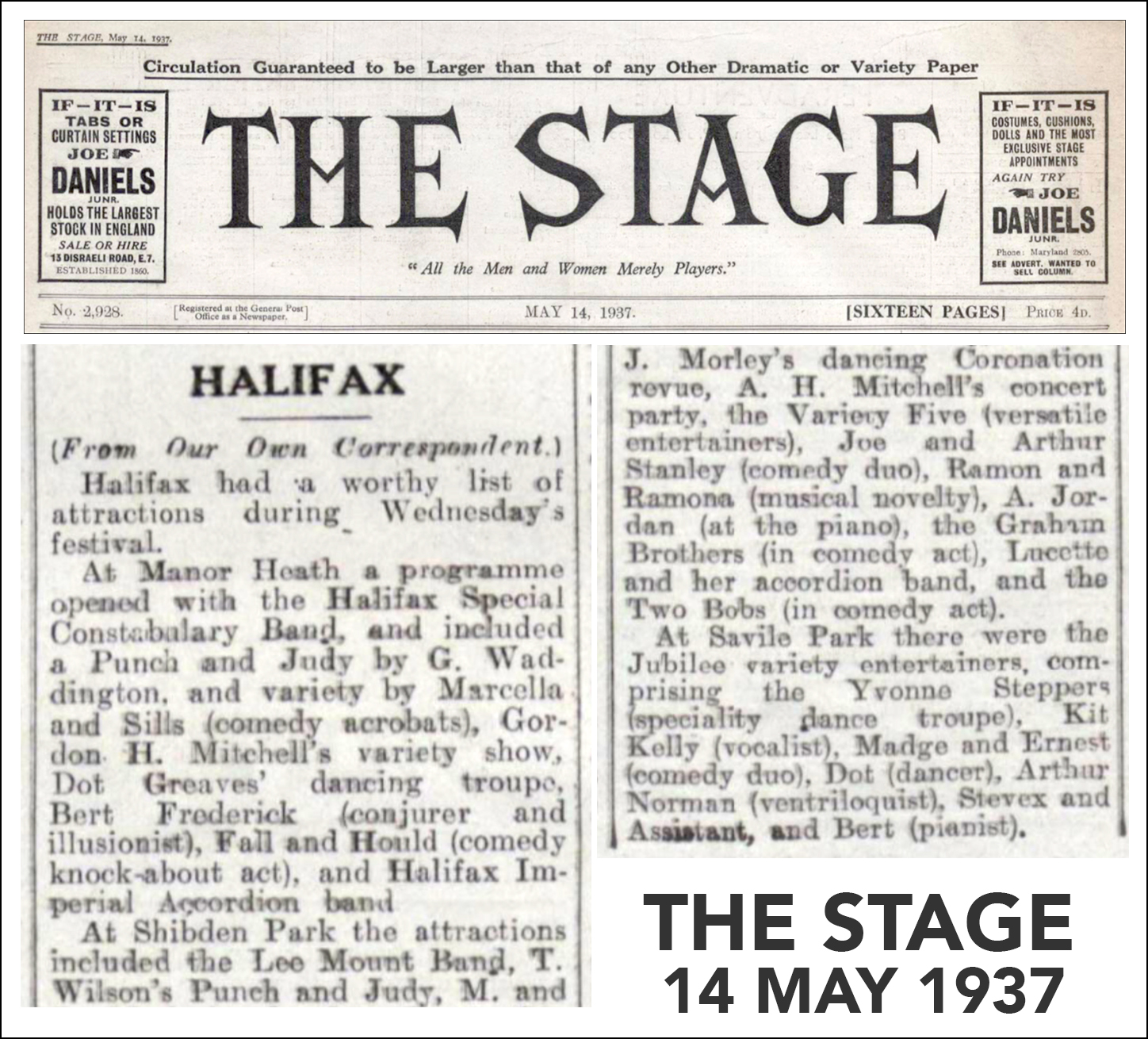 It’s Wednesday 12th May 1937 and the entire country is celebrating – it’s the coronation of King George VI and Queen Elizabeth. Whilst most eyes were focussed on the grand events in London and the other big cities, The Stage decided to look at the entertainments provided for the good folk of Halifax on that day. Events were held at Manor Heath, Shibden Park and Savile Park and no expense was spared in attracting the very best entertainers to the town. The Special Constabulary Band played at Manor Heath before Marcella and Sills showed off their acrobat skills and Fall and Hould did their comedy knock-about act. At Shibden Park Joe and Arthur Stanley made people laugh and Lucette and her Accordion Band kept them humming away. At Savile Park Kit Kelly sang, Dot danced and Bert played the piano. A day to remember indeed.