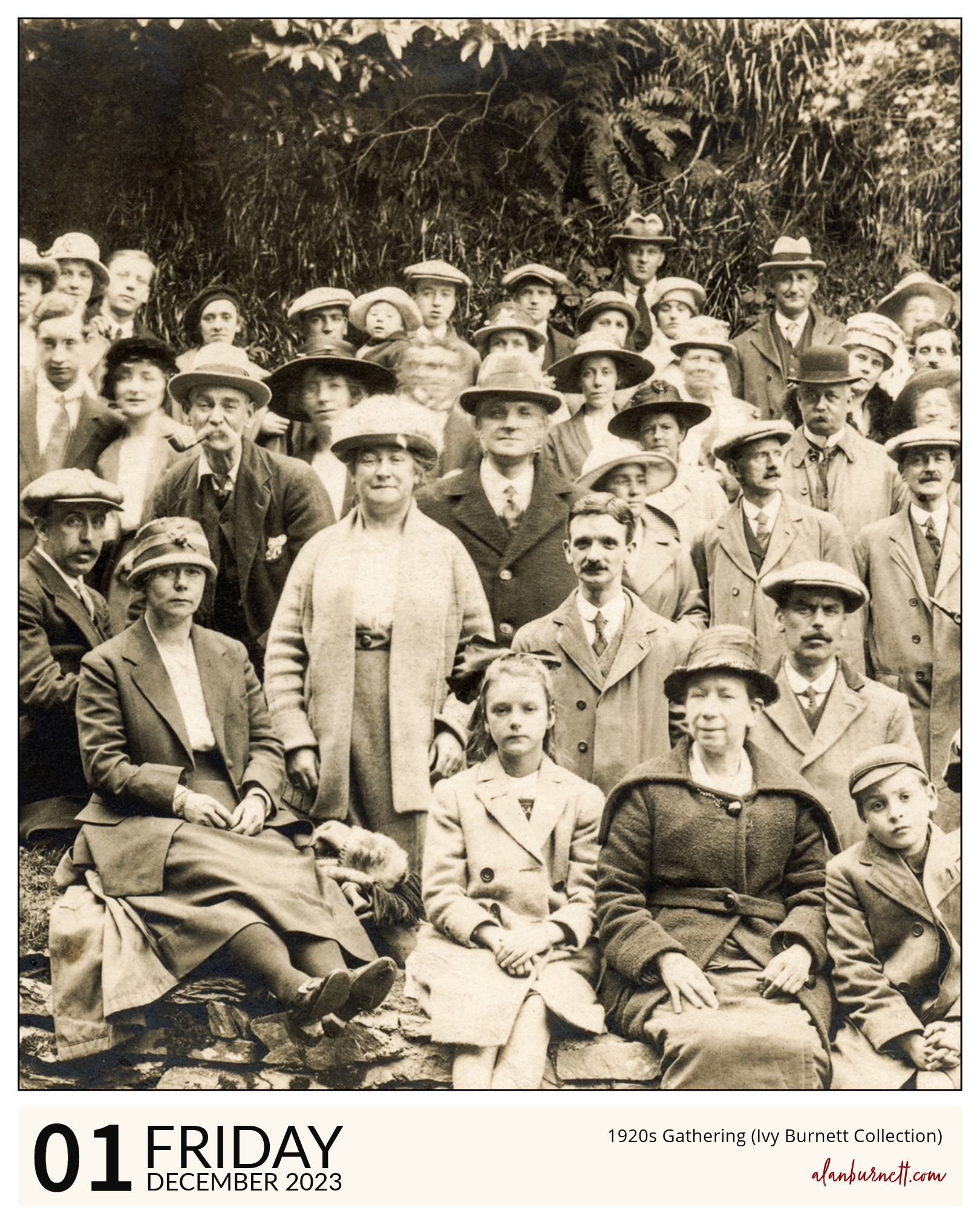This photograph comes from the collection put together by my fathers’ cousin, Ivy Burnett. She was born in 1906 so she may have been part of this gathering which looks as though it dates from the early 1920s. The faces are fascinating: the studied expressions were a necessity of slow shutter speeds. In every crowd, however, there is always someone who can’t keep still – yes, I’m talking to you back there on the second row from the back near the middle!