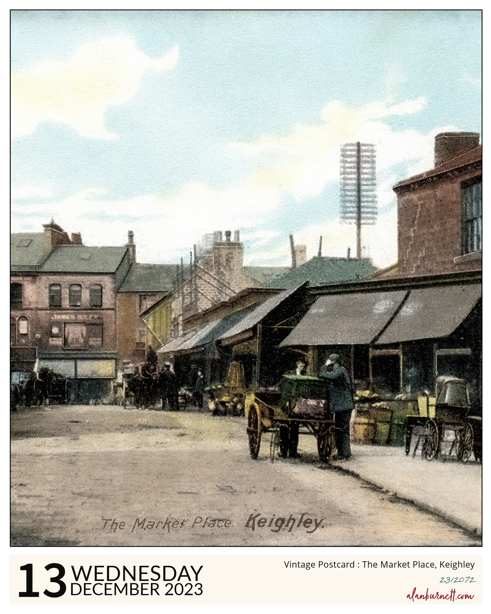 The image is taken from an old vintage postcard featuring Keighley’s Market Place and comes courtesy of Great Uncle Fowler Beanland’s picture postcard collection (all praise elderly collectors of things for making the lives of future generations more intriguing). Whilst the market is interesting, I have to say my attention was captured by the splendid old telegraph pole. Why did early poles have so many “arms”? Someone will no doubt tell me.