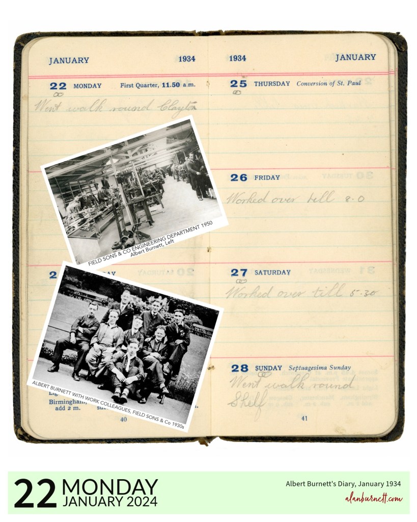 By the week beginning 22nd January 1934, my father seems to have been doing nothing but working over and walking. I think that by 1934 he was working in the Engineering Department at Field Sons & Co at Lidget Green, Bradford. He was certainly working there by the late 1930s.