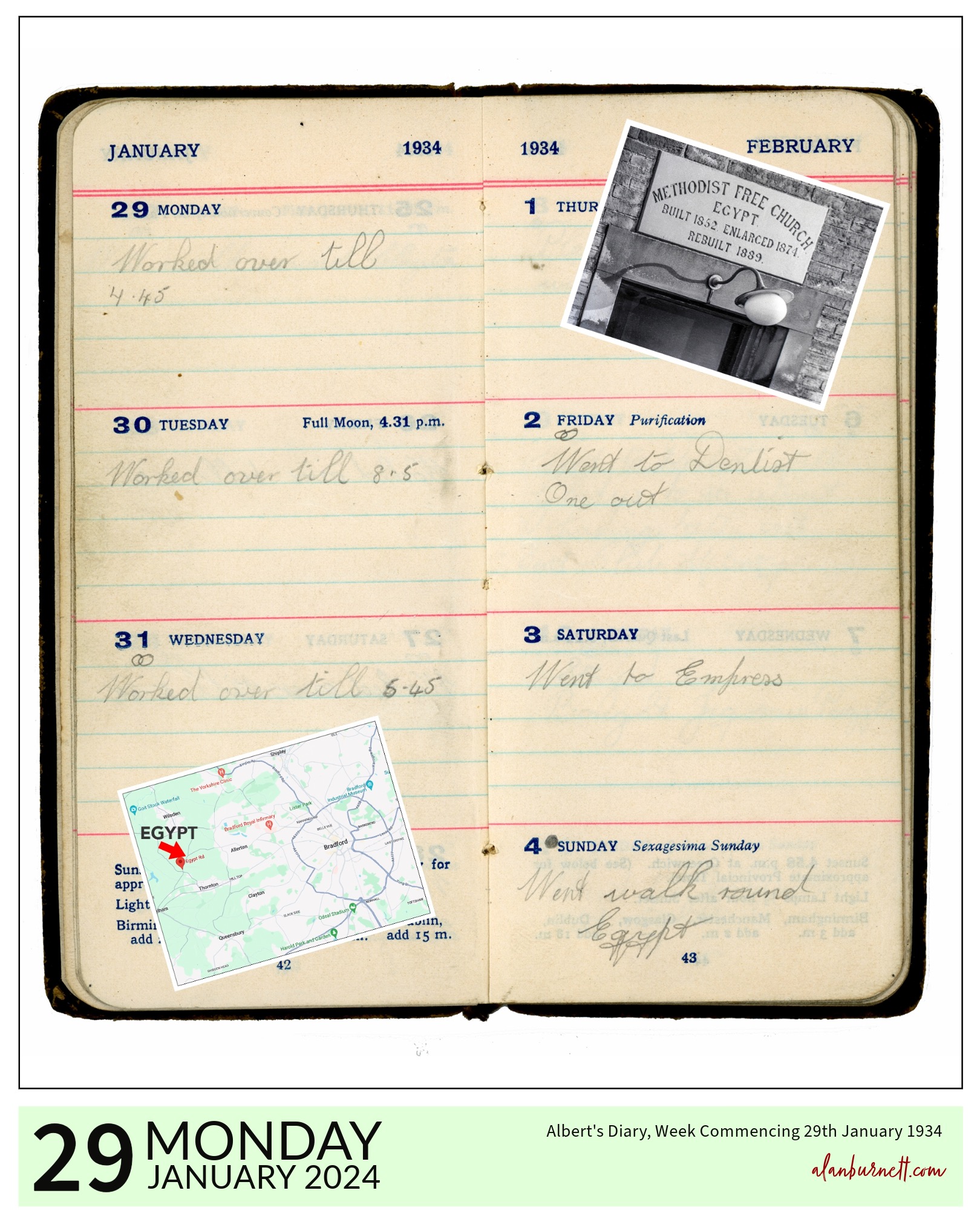 Until we ventured to France in the 1960s, it was my understanding that my father had only ever been abroad once – and that was a day trip to Calais in the 1930s. Thus initially I was surprised to see in his diary for this week in 1934 that he had gone walking around Egypt! The solution was to be found, of course, in the hamlet of Egypt just north of Thornton near Bradford.