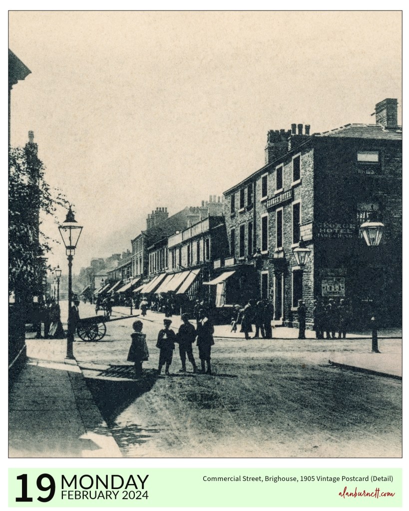 The scene is still fairly easily recognisable for those who know Brighouse: the point where King Street become Commercial Street. The George is still going and most of the buildings on the top side of Commercial Street are the same. The shop blinds, the hand cart and the gas lights are long gone, but Brighouse goes on.