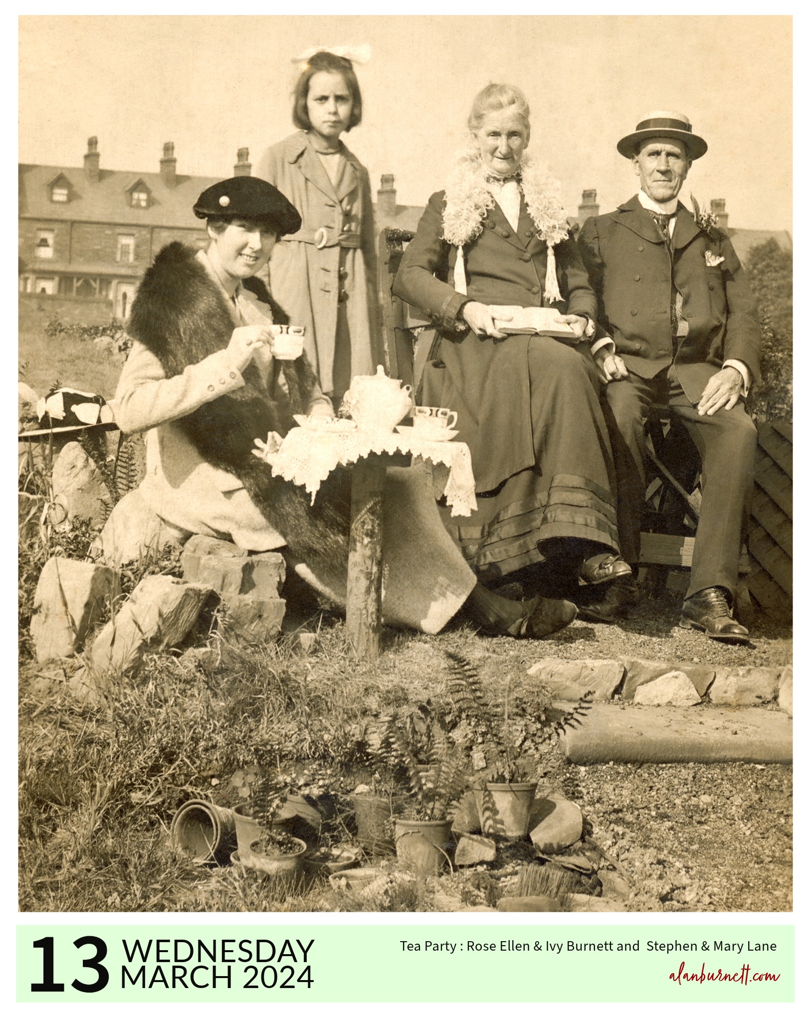As far as I can tell, the photograph features my father’s Aunt Rose-Ellen (left) and her daughter, Ivy. The elderly couple are Rose-Ellen’s parents, Mary and Stephen Lane, and I suspect the location of this wonderful tea party would have been opposite their house in Bradford. It’s a perfect treasure of a photograph which deserves to be shared with the world.