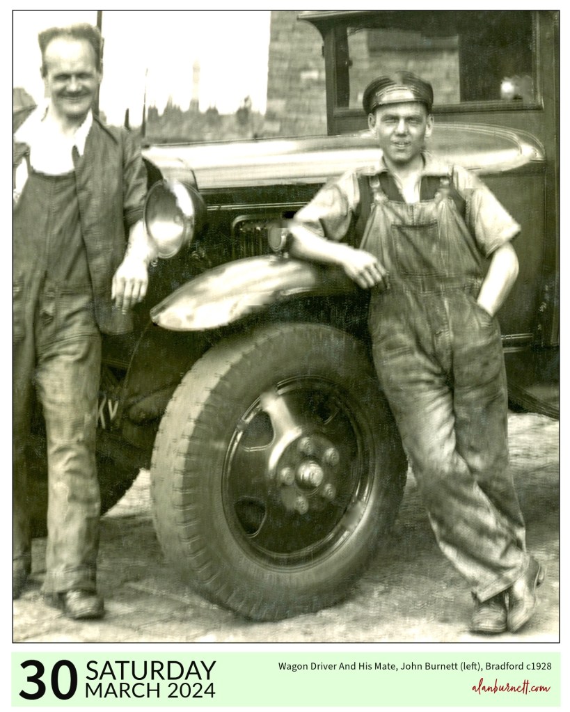 The time must be somewhere around the late 1920s. The place will have been Bradford. The man on the left is my Uncle John, who was a wagon drivers’ mate. Not sure who the wagon driver – the one with the cap – was. The star of the photo shoot, however, must surely have been the wagon.