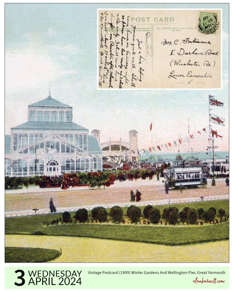 The postcard dates back to the first decade of the 20th century and shows the Winter Gardens and Pier in Great Yarmouth. As is so often the case, the message on the back of the card is far more interesting than the somewhat crude image on the front. “Dear Mother, Just a line hoping you are quite well. Shall come home on Saturday night so please have bed ready as I shall retire early. I shall come home straight from Brixton after rehearsals, I expect about 11.00pm. Love to Dad, yourself and all, Yours, Bert”