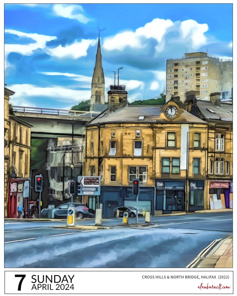 Without intending to do so, I appear to have produced a trio of images of the junction between Cross Hills and North Bridge, Halifax. Friday’s was a photograph of mine from 40 years ago, yesterday’s a picture postcard from 120 years ago, and today’s an image from just two years ago. I’ve messed about with this latest photo, gone a little overboard with the artistic filters – but the view can take it. It’s old and new Halifax in all its glory.
