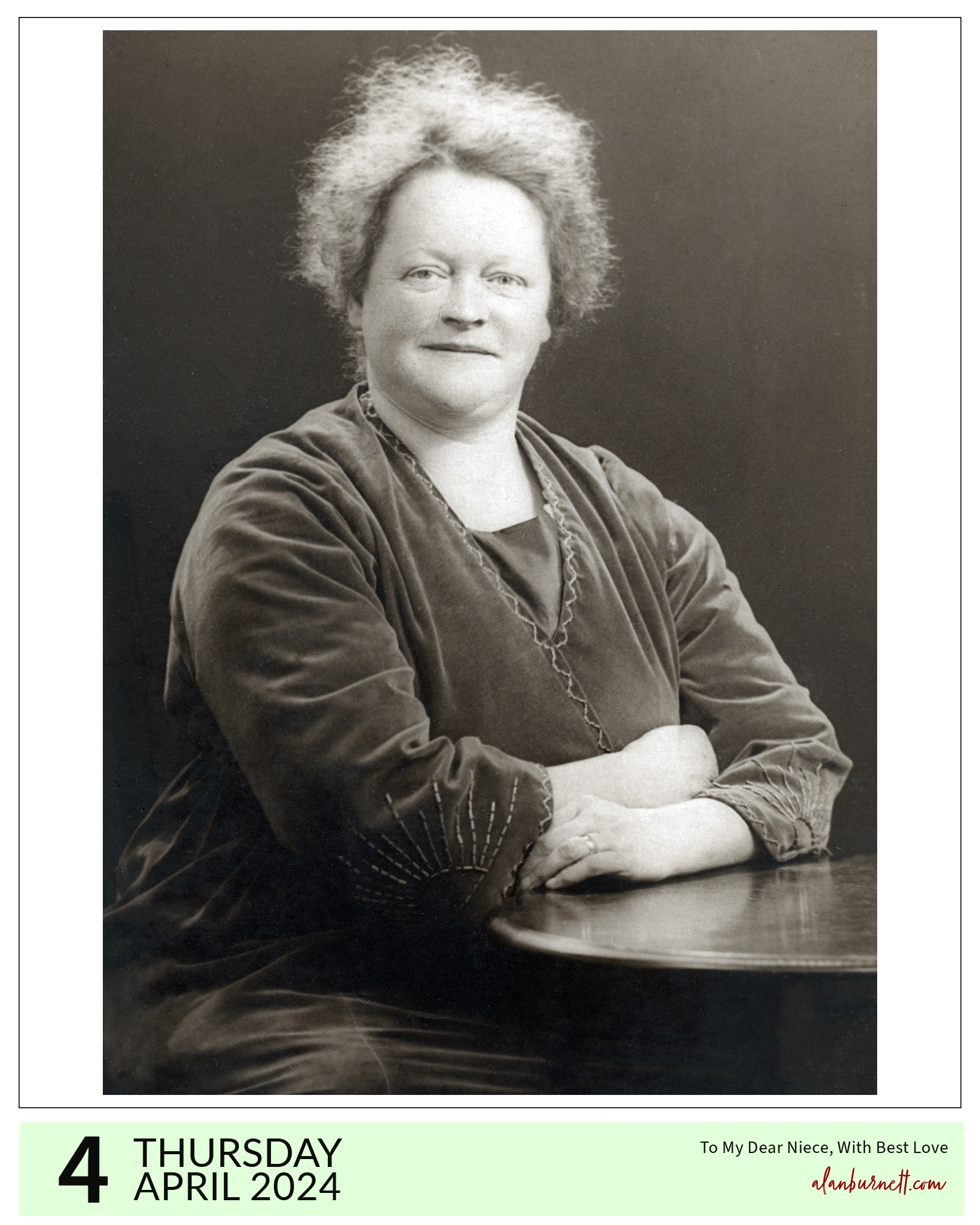 Sometimes I choose the subjects for my daily desktop calendar, other times they choose themselves. This redoubtable character chose herself. It might be my Great Aunt Ruth-Annie or her sister Miriam or it might be any of a half dozen sisters from a different branch of the family. Whoever she is, she sent her portrait to my father’s cousin and signed it “To my dear niece with best love”. She has a smile the width of the Humber Estuary and hair by Van de Graaff. Whoever she was, I would have liked to have met her.
