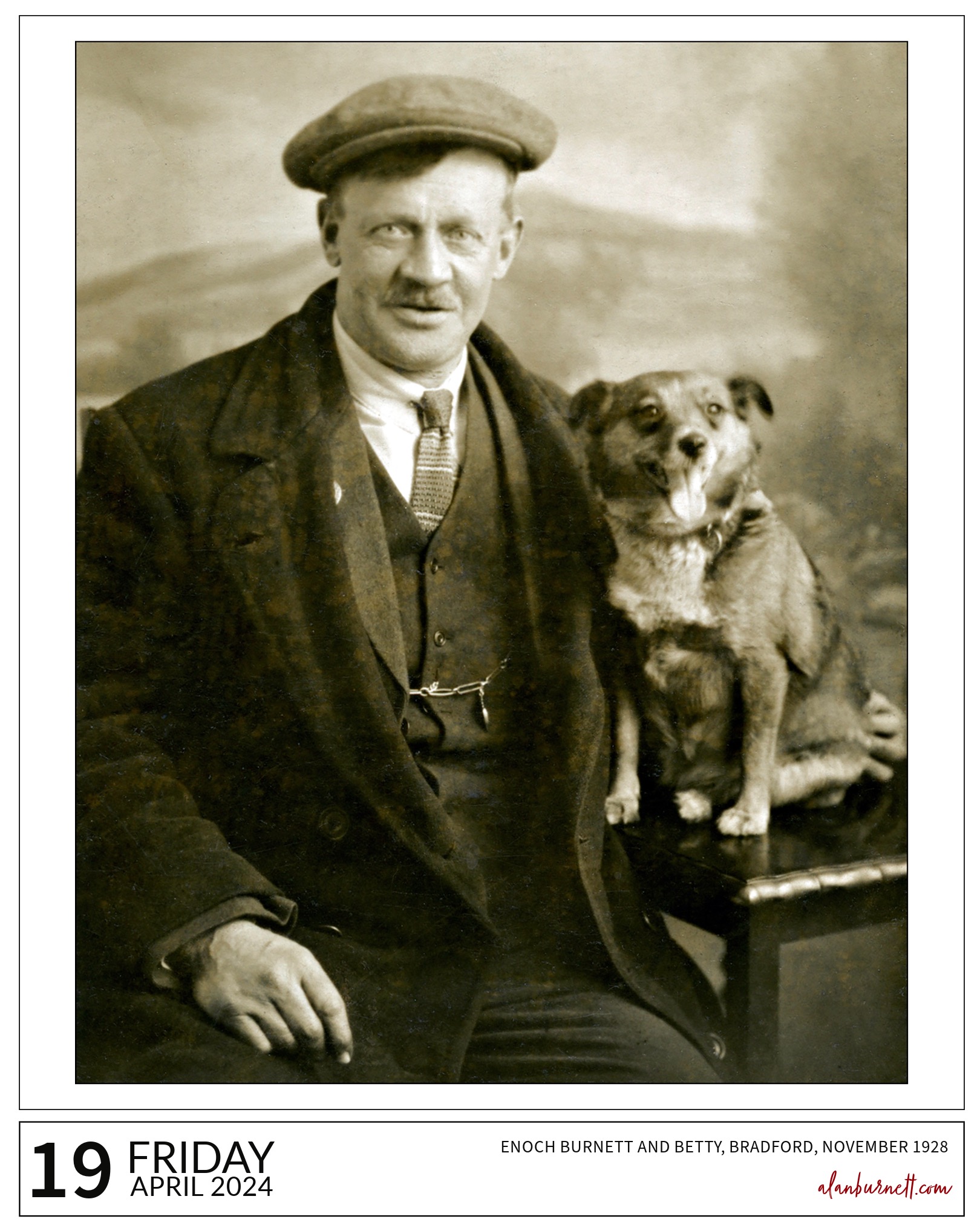 A date stamp on the reverse of this studio portrait of my grandfather, Enoch Burnett, gives me a precise date – the 18th November 1928. At the time, Enoch will have been 51 years old and working as a window cleaner in Great Horton, Bradford. He is joined in this portrait by his dog, Betty, who, according to family legend, “was a good ratter”.
