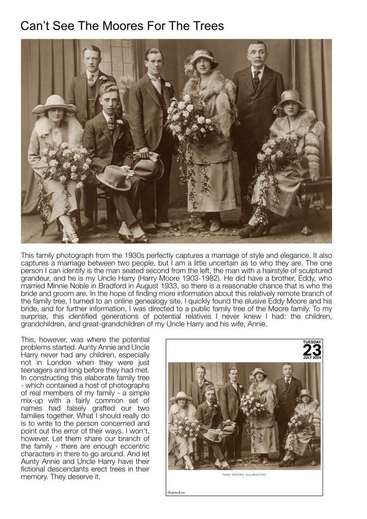 This, however, was where the potential problems started. Aunty Annie and Uncle Harry never had any children, especially not in London when they were just teenagers and long before they had met. In constructing this elaborate family tree – which contained a host of photographs of real members of my family – a simple mix-up with a fairly common set of names had falsely grafted our two families together. What I should really do is to write to the person concerned and point out the error of their ways. I won’t, however. Let them share our branch of the family – there are enough eccentric characters in there to go around. And let Aunty Annie and Uncle Harry have their descendants erect trees in their memory. They deserve it.