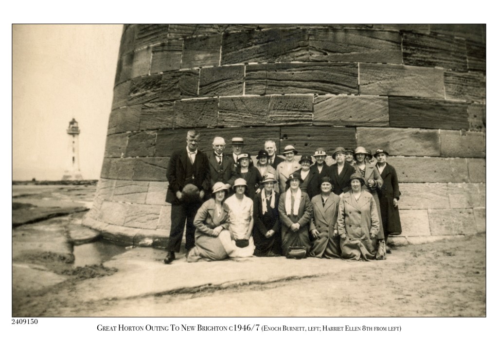 New Brighton was a popular destination for bus trips from East Lancashire and West Yorkshire; I can recall many of my childhood holidays at one or more boarding houses in the town. Enoch and Harriet lived all their lives in the Great Horton district of Bradford, so it seems likely that the group was from there. It’s sad to think that this is Enoch in his final months of life. Comparing the photographs with others I have of him, it is almost a though some of the life has already been drained out of him. Harriet lived for another ten years after this photograph was taken, and I have more formed memories of her. For Enoch, however, my memories are constructed from oft-told family stories and images such as this one of an outing to New Brighton.