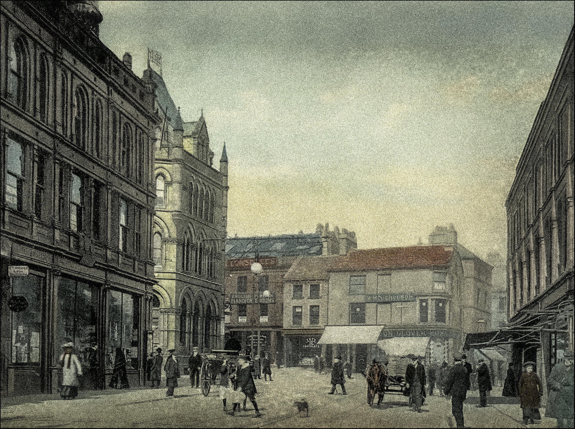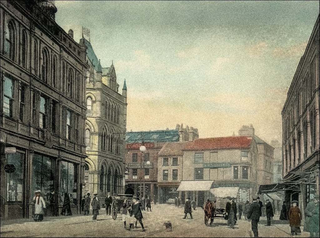 It took me a few moments to fit the scene depicted in this 1908 postcard of Hall End, Halifax, into my late twentieth-century perceptions of the town. “Hall End” was not a description I was immediately familiar with, nor were the buildings in the center of the scene. The rather grand building which is center-left in this view is so typically Halifax; however, it didn’t take me too long to recognize the point at which Silver Street and Crown Street converge. The grand building was the home of the Halifax Commercial Banking Company – it later became Lloyds Bank – and today it is known as “The Old Bank” and is occupied by a variety of retail and commercial ventures. Those buildings in the centre – Nicholson’s the glovers and Lonsdales, the piano seller – were eventually demolished in the 1920s and replaced by another grandiose bank building which was built for the National Provincial Bank and is now the home of NatWest. The building on the right is still there today, whilst the one on the left was demolished in the late twentieth century to make way for a couple of concrete boxes as part of a scheme to punish the town for being too architecturally interesting.