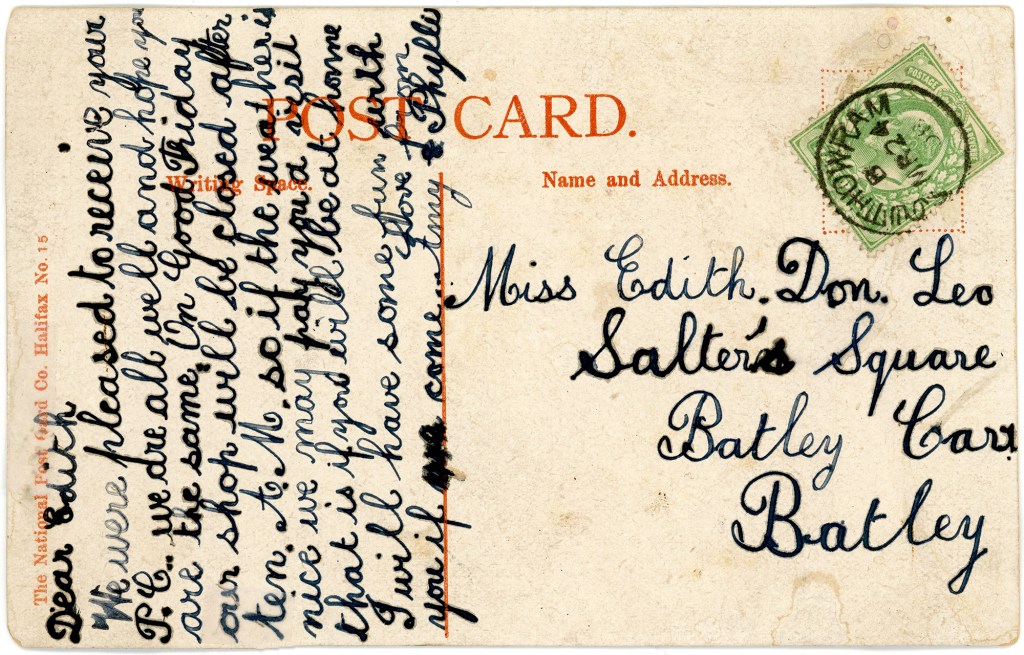 The card was sent by Amy and Phyllis to their friend, the splendidly-named Edith Don Leo (surely there is a genealogical tale behind that name well worth researching!). The message reads as follows:-