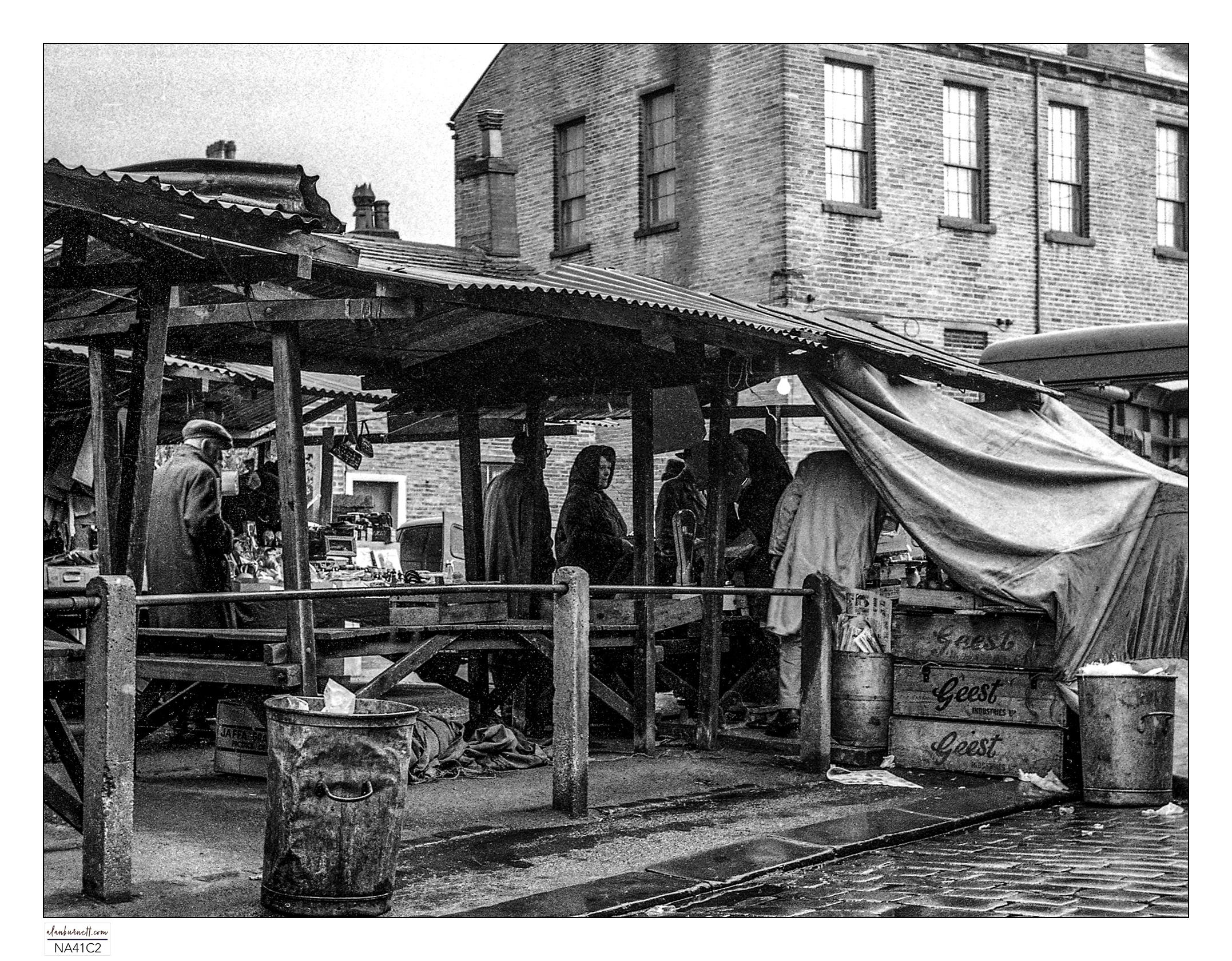 Brighouse is in the process of getting a new market. My photograph isn’t of the old market – it’s of the even older market. I’m not sure what the new building will turn out like, but I doubt whether there will be a corrugated iron roof nor tarpaulins stretched over banana boxes.