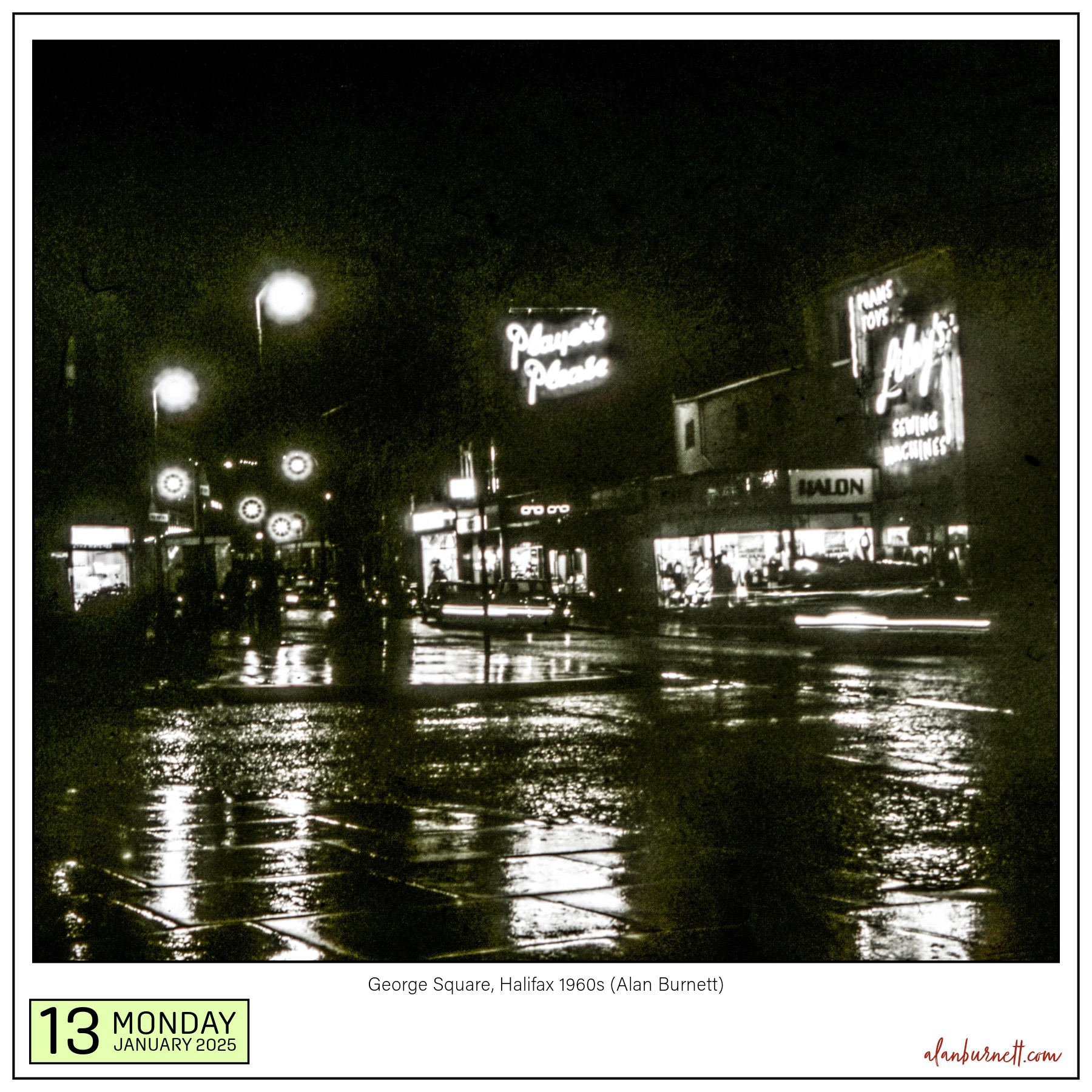 This is a photograph of George Square in Halifax, taken – as far as I can remember – in the mid 1960s. You don’t get to see much, just a few neon signs and fuzzy shop windows, but you don’t need to see much to spark a memory. This is Halifax’s answer to Times Square or Piccadilly Circus: a tobacconist and a pram shop. You might not be able to hear it, but there is a soundtrack playing in the background to this picture: something suitably smokey and jazzy. The rain is falling, and you are on your way home from the pictures; heading for the bus stop hoping to make the last bus home. Neon memories.