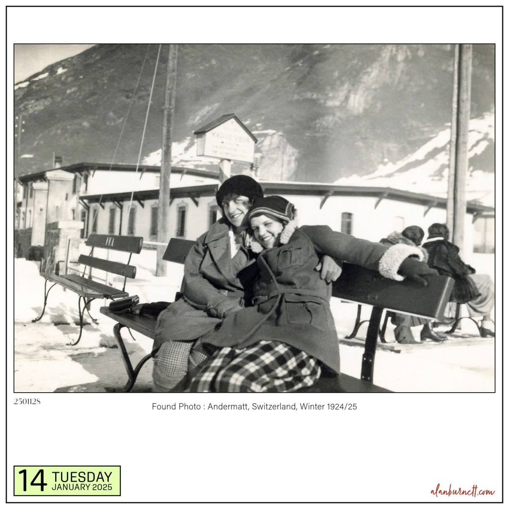 At last, the snow and ice are becoming a memory. The snow in today’s photo is a memory from 100 years ago. I’ve no idea who these two are, but the photo is captioned “Andermatt, Switzerland”. It’s a joyous image – despite the snow.