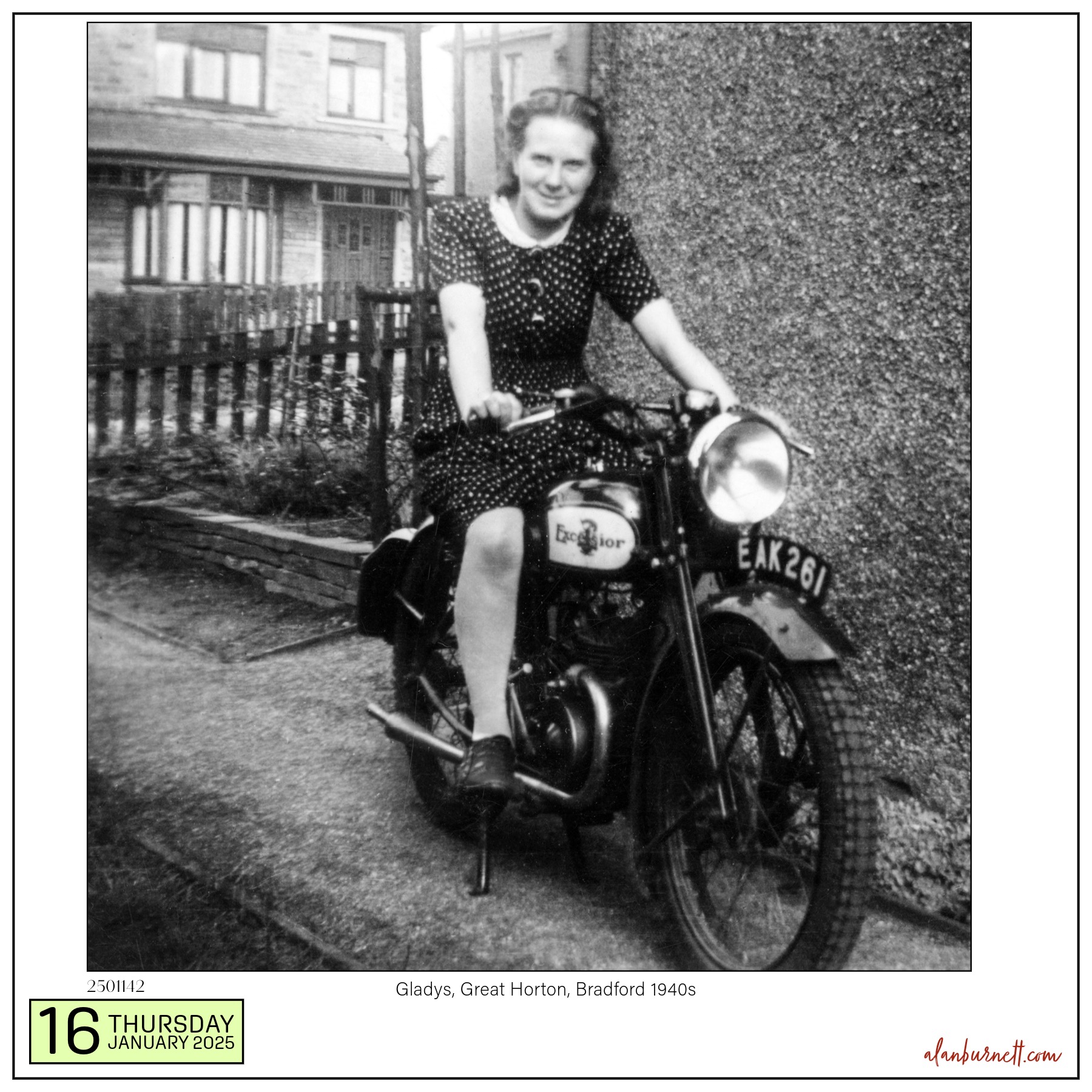 This photo of my mother sat on my fathers’ Excelsior motorbike dates, I think, from the 1940s. It was taken at our house on Southmere Drive in Bradford, and I recognise that path and that fence, even though we moved away from Bradford in 1953 when I was just 5. The fence I remember well, but I have no memory of the motorbike.