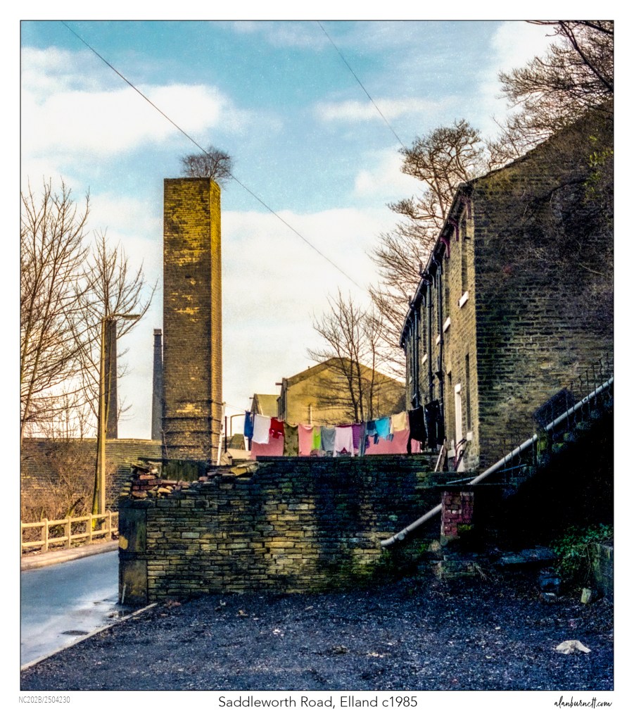 As Saddleworth Road runs into the town of Elland, there is a strange outcrop of trees sprouting out of the tops of truncated mill chimneys. This phenomenon is unique to this area and biologists travel from around the world to witness it. My 1980s photo captures it at an early stage of development, but I am having difficulty tracking down which chimney this actually is.