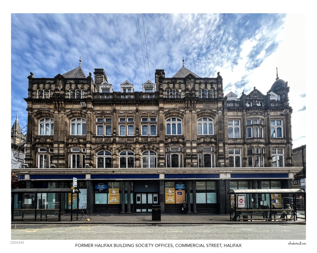 Looking Up At Halifax 2 : To me, this will always be the Halifax Building Society Headquarters. I was leaving the town as the new Trinity Road HQ was arriving, and by the time I returned, everything had changed names. This was the building I got my pass book from and it was here I brought my savings box for emptying. Before the Building Society moved in, in 1921, it was a department store. Another grand building.