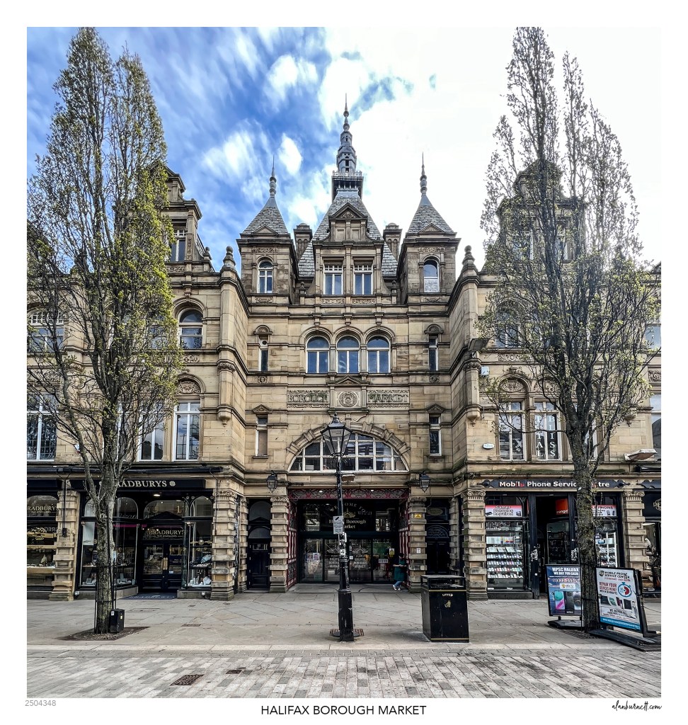 Looking Up At Halifax 3 : Any picture of Halifax’s beautiful Borough Market risks opening the floodgates of nostalgia. Why can’t it be full of lovely, quaint shops selling biscuits from large tin boxes? Why can’t you get divi by quoting your Co-op number anymore? Forget all that for the moment; just look at the building and rejoice that it is still there.