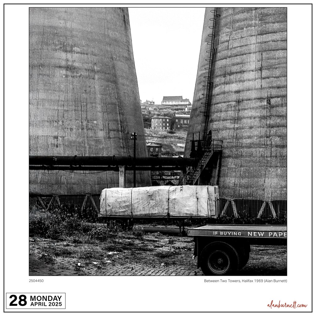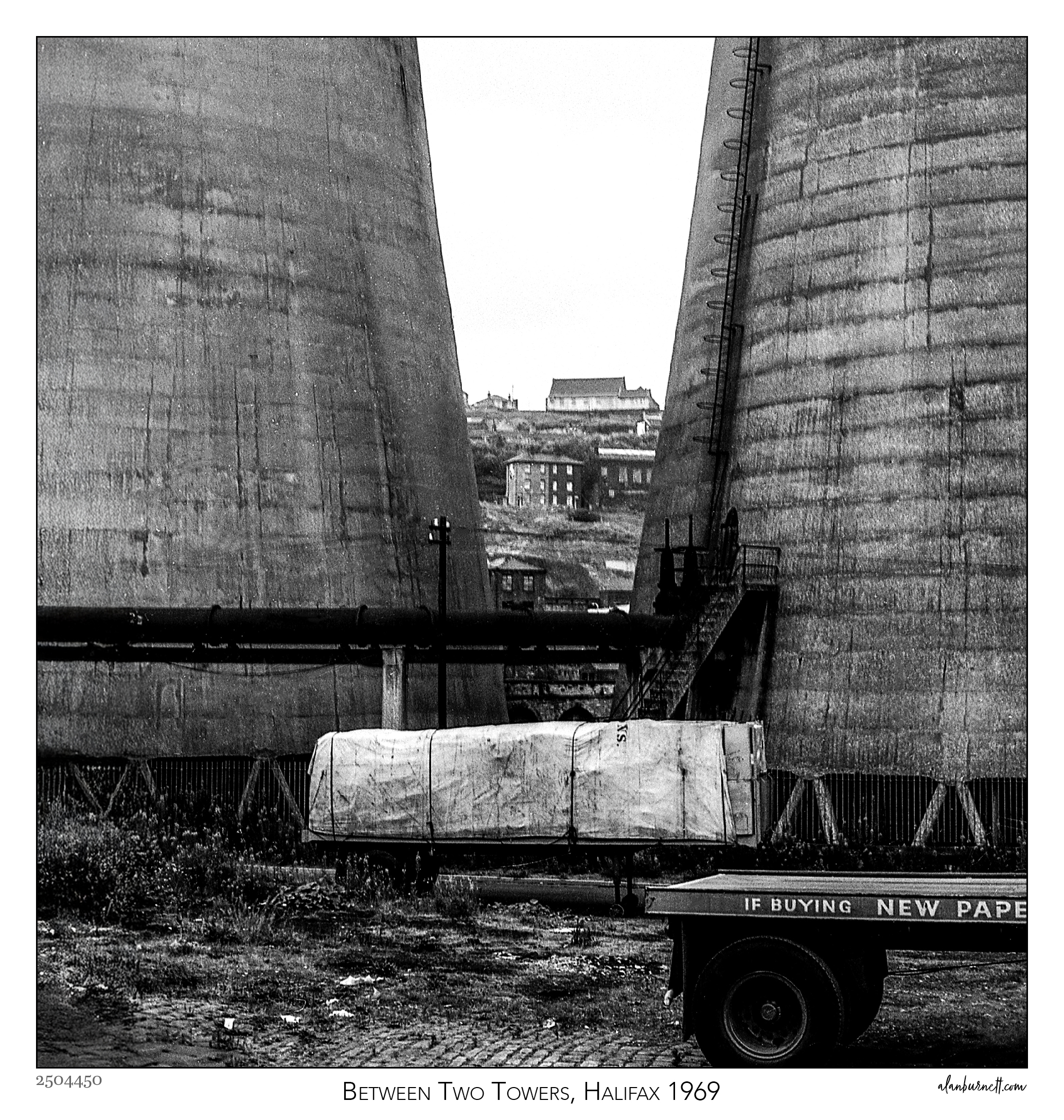 A view of a Halifax hillside sandwiched between two cooling towers. The two towers were affectionately known to the locals as “Salt” and “Pepper,” and together they created a kind of structural condiment set in what is now Sainsbury’s car park. They were eventually demolished in 1974, although it took two attempts before they were finally flattened.