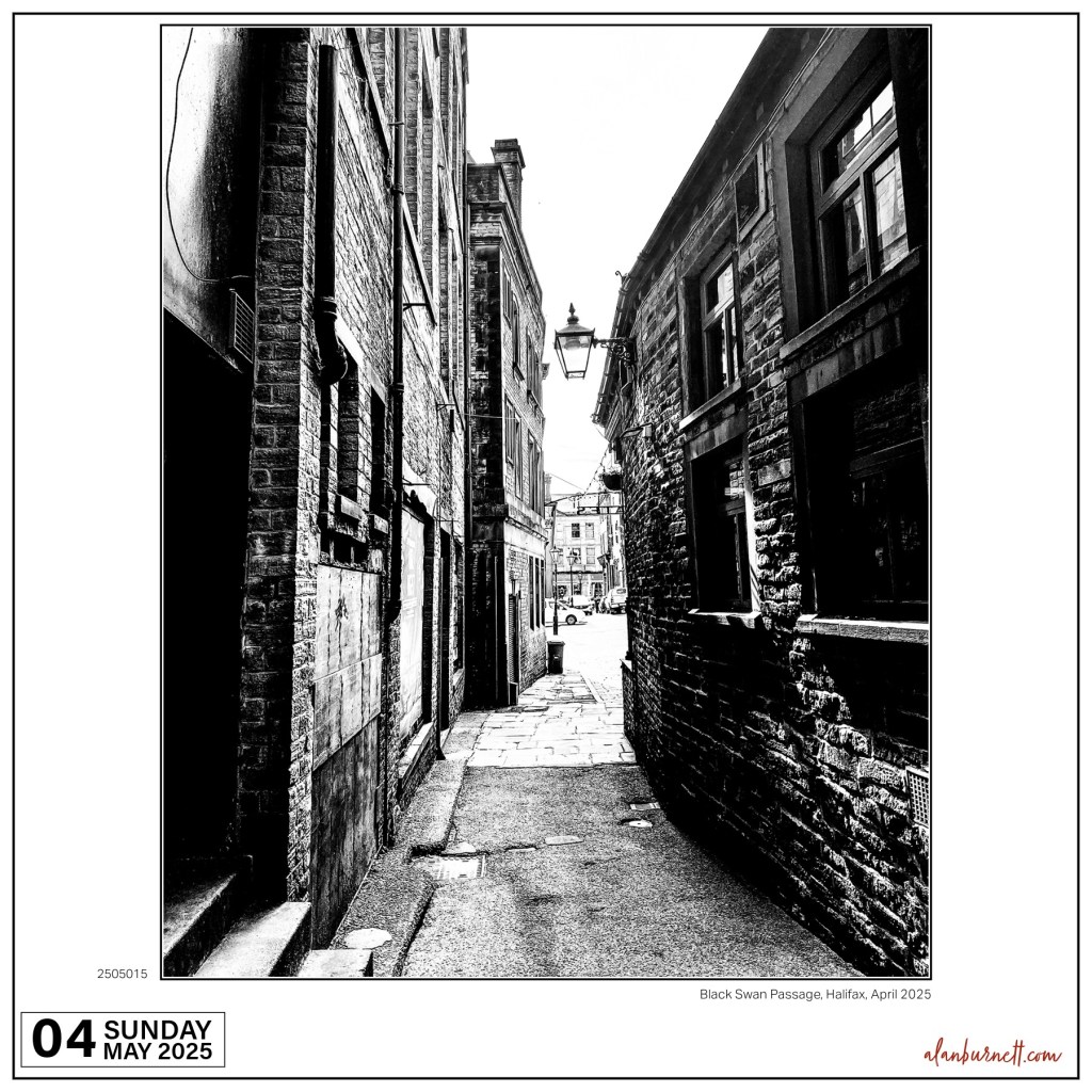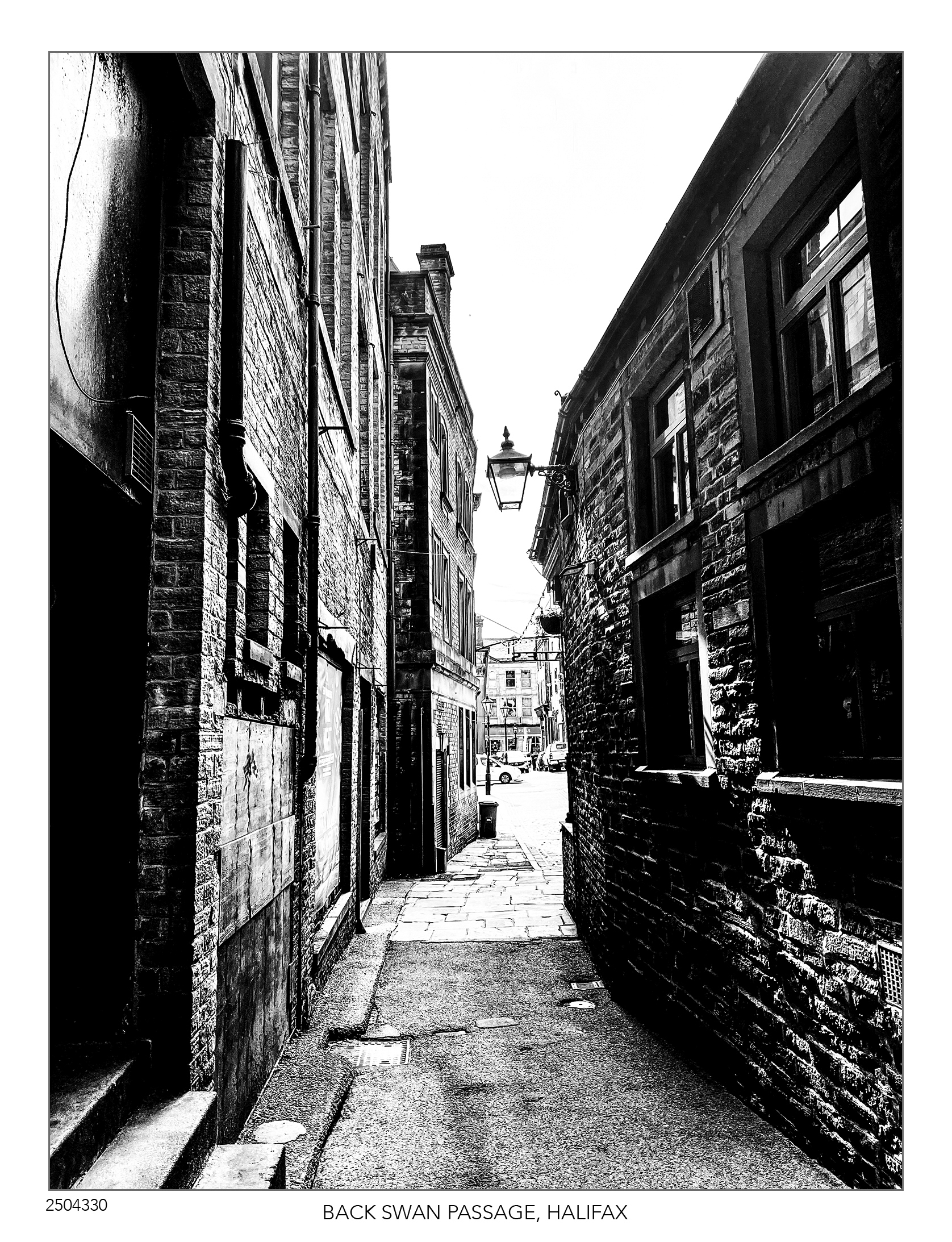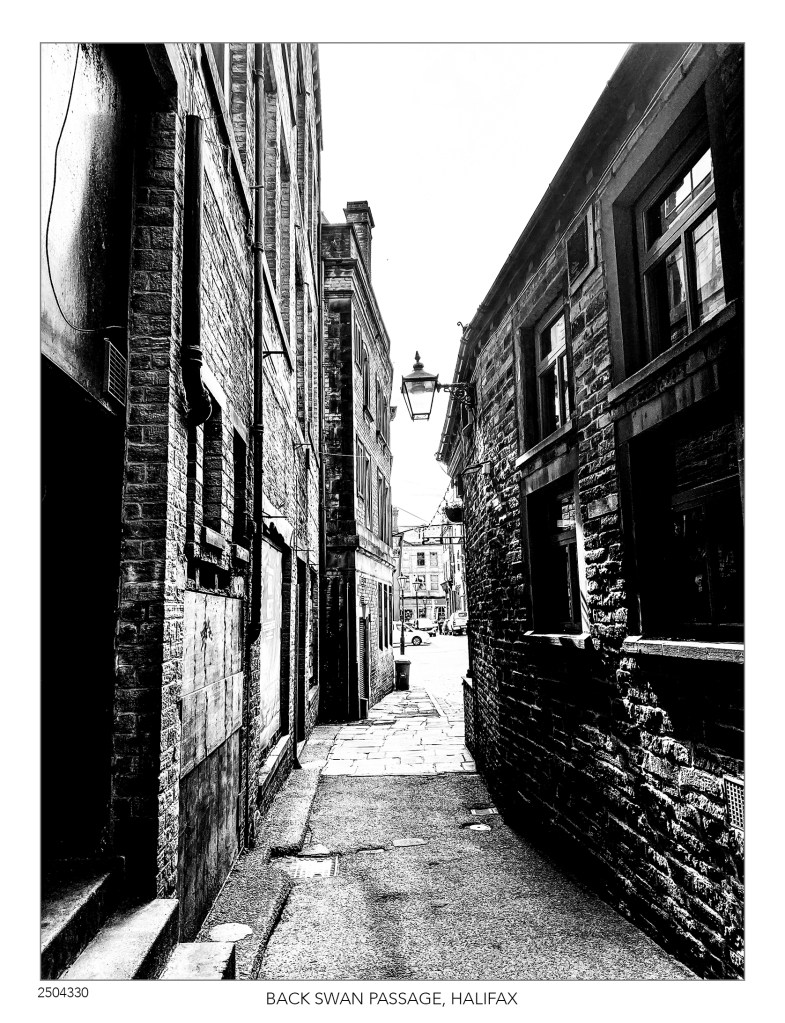 Black Swan Passage in Halifax, so named because it was a passage down by the side of the old Black Swan Inn on Silver Street (approximately where Yates’s Wine Lodge is today). This black and white photograph does it justice. For the sake of balance, however, I need to take a white and black photograph of the White Swan Hotel.