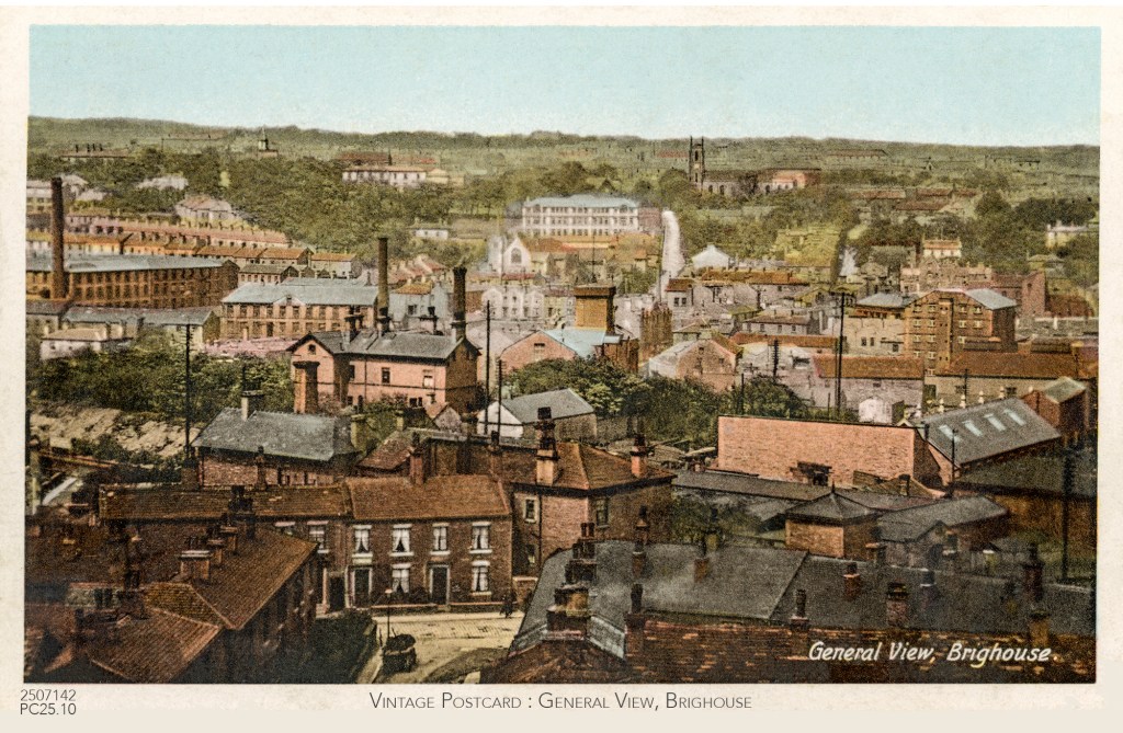 The illustrations on old picture postcards from the turn of the twentieth century usually have a specific focus – a prominent building, or a bridge, a park or local beauty spot. The title of this postcard is, however, “A General View Of Brighouse”. and that is exactly what you get – mills, houses, chimneys and the occasional church. You can have hours of fun trying to spot what’s still there and what is long gone.