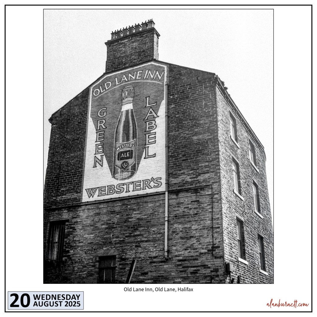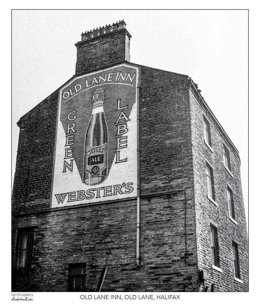 I must have taken this photograph of the Old Lane Inn, Halifax, in the mid-1960s, by which time it had already closed. It briefly came back to life as Dicky Mints 20 years later, before closing again, and eventually, the building was demolished. The monumental bottle of beer painted on the gable wall should have been listed and saved for posterity.