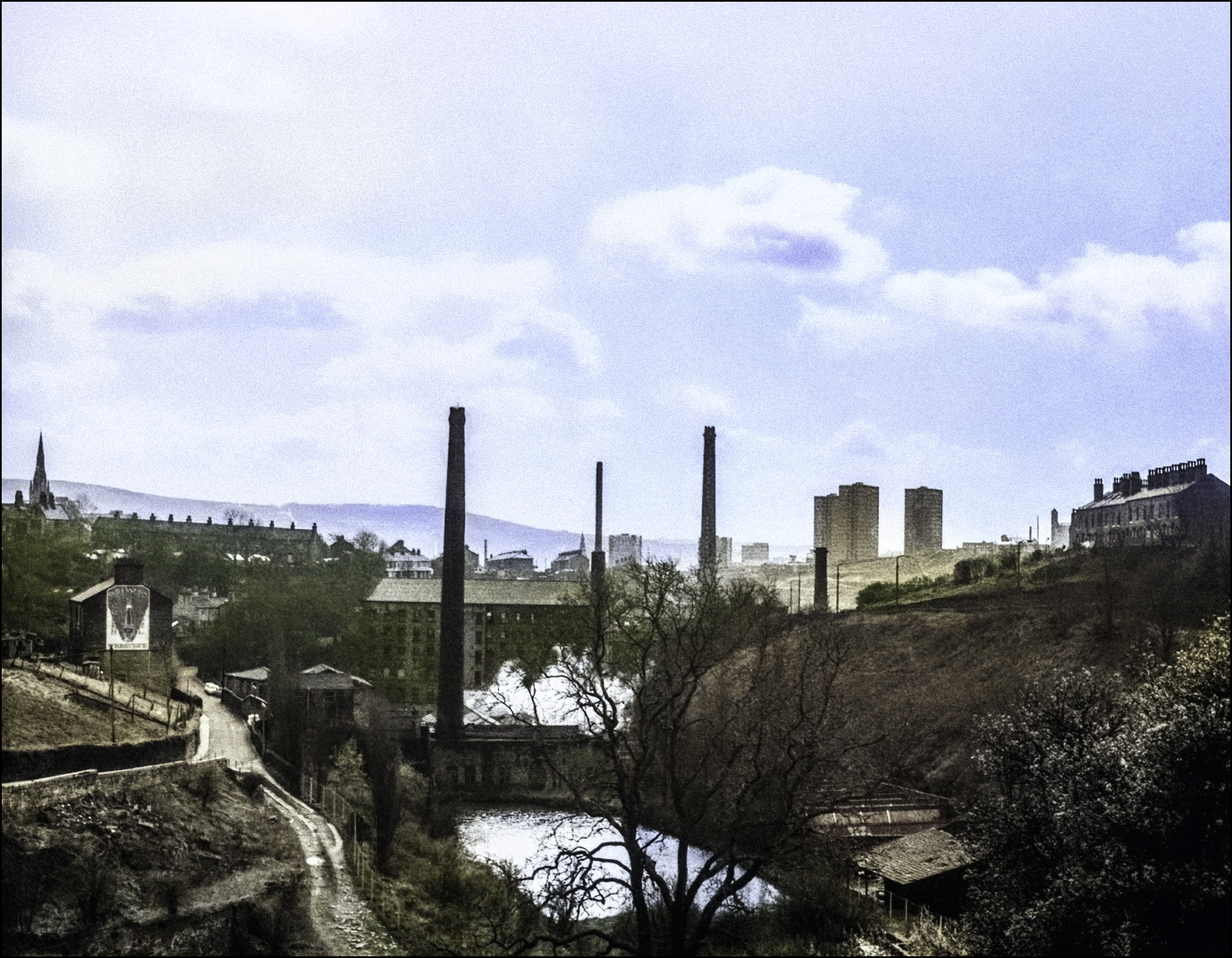 The colour isn’t particularly real – I must have added it at some stage in the fifty or so years since I took the original photograph. We tend, however, to think of Halifax back in the ’60s and ’70s in terms of black and white, forgetting that the mill-ponds could occasionally reflect blue skies. You may recognise the gable-end art from a picture I shared last week.