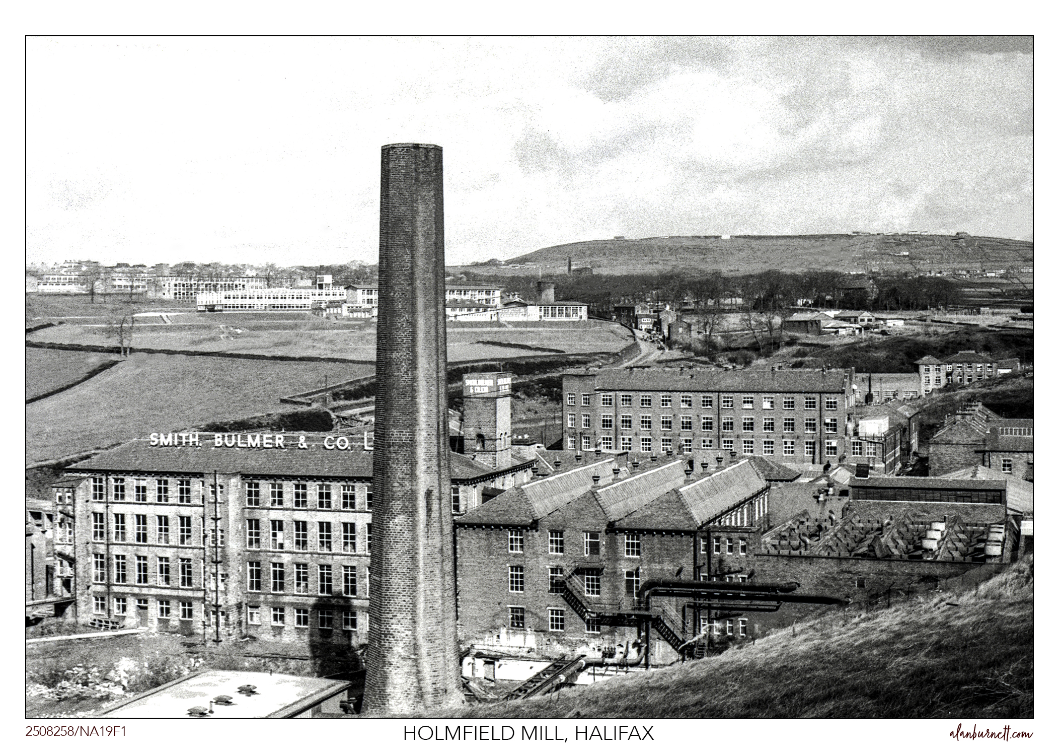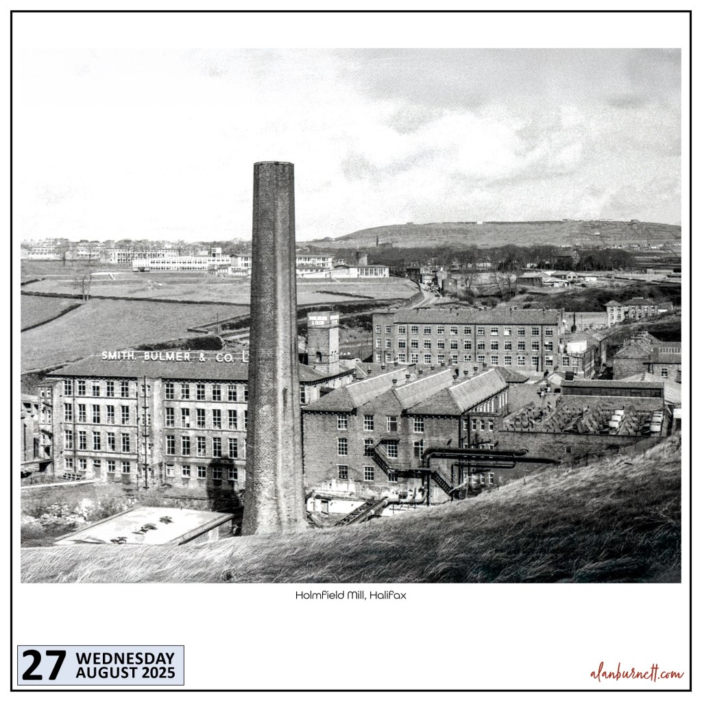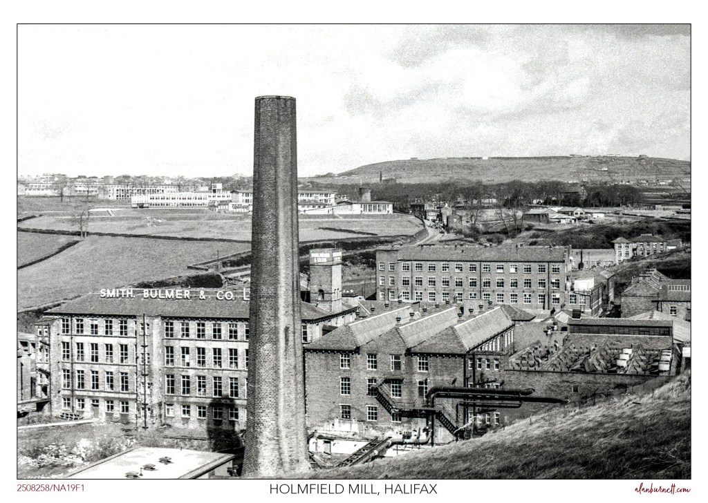 Holmfield Mill in Halifax – a photograph I must have taken in the late 1960s or early 70s. I had a summer job there at about that time, working as a “bobbin-ligger” – collecting used bobbins from around the mill and stacking them in pointless piles.