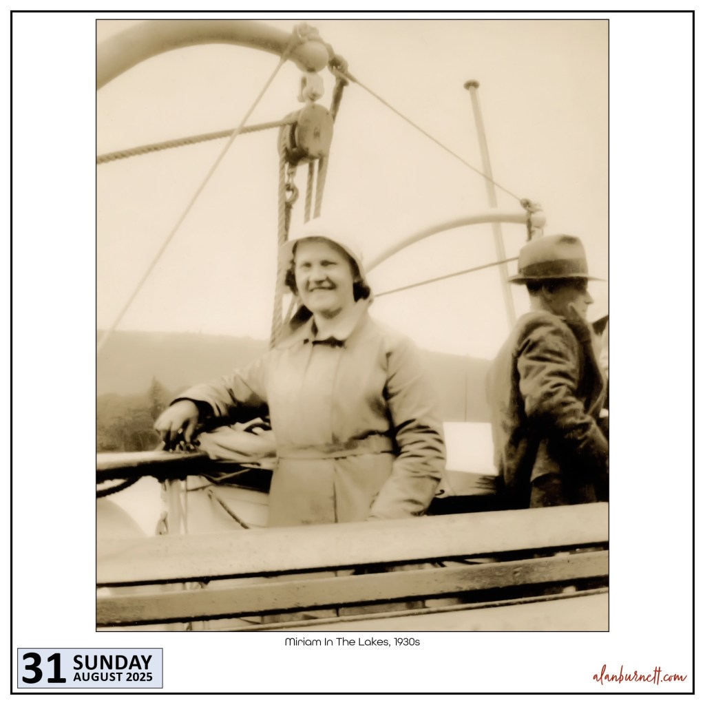 My visit to the Lake District concludes with this rather wonderful photograph of my Auntie Miriam taken on a boat there ninety or so years ago. Whilst Miriam’s smile is, as always, engaging, my attention is immediately captured by the passenger in the rather wonderful hat.