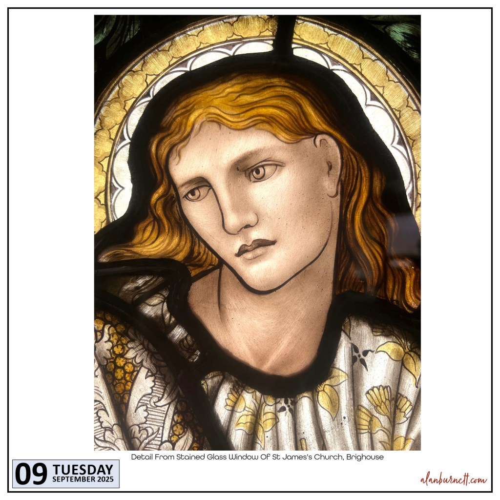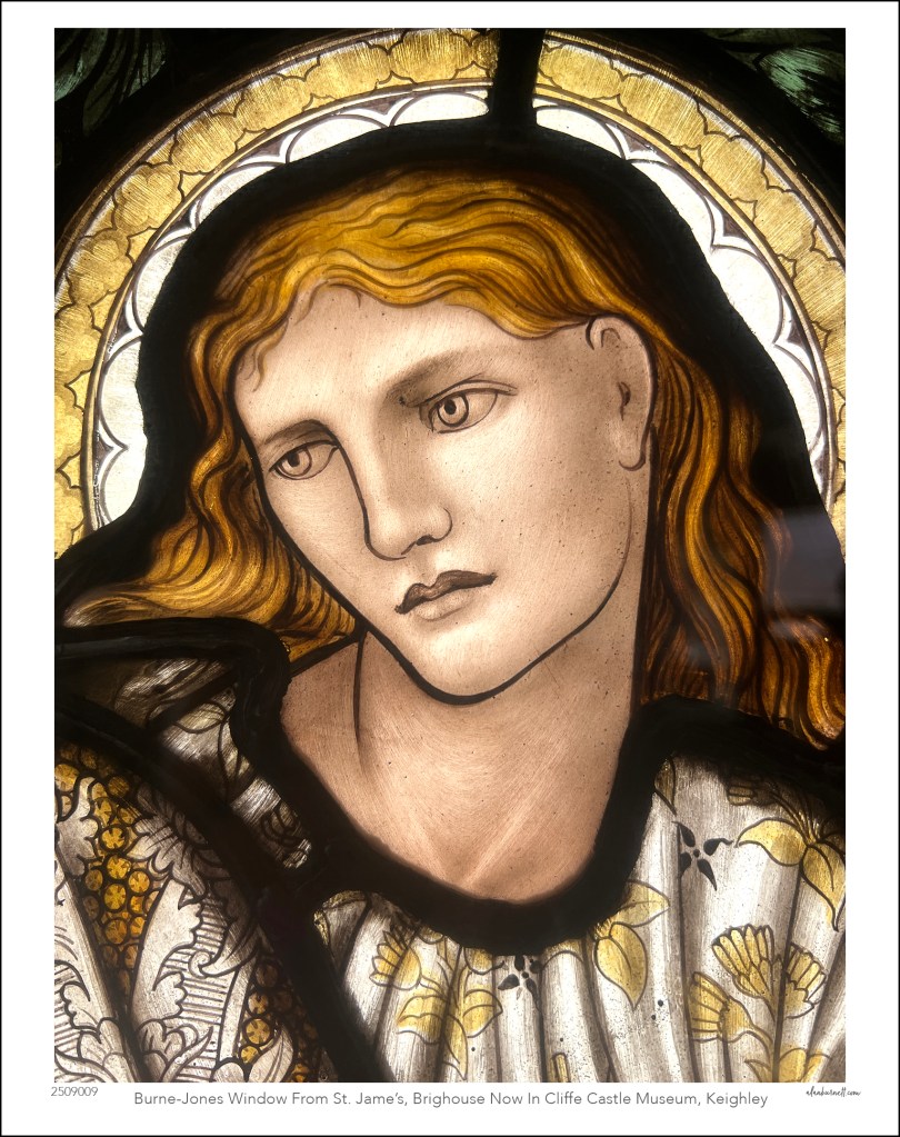 I visit this lady as often as I can. She is from Brighouse, but now lives in the delightful Cliffe Castle Museum in Keighley. She was created by the great Victorian Pre-Raphaelite painter, Sir Edward Burne-Jones, for St James’s Church in Brighouse, and she remained in the town until the church was demolished in 1972. Now, when we meet, we reminisce about the old times and marvel at what the world has become.
