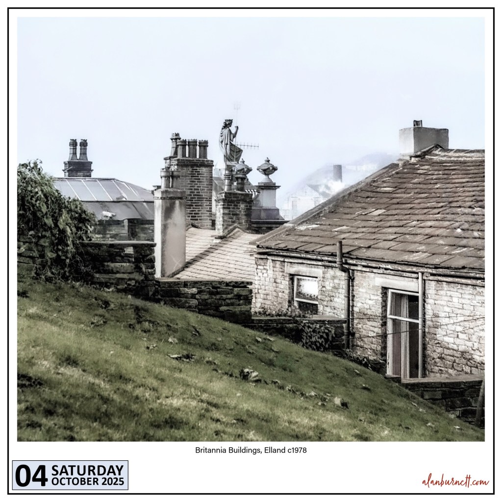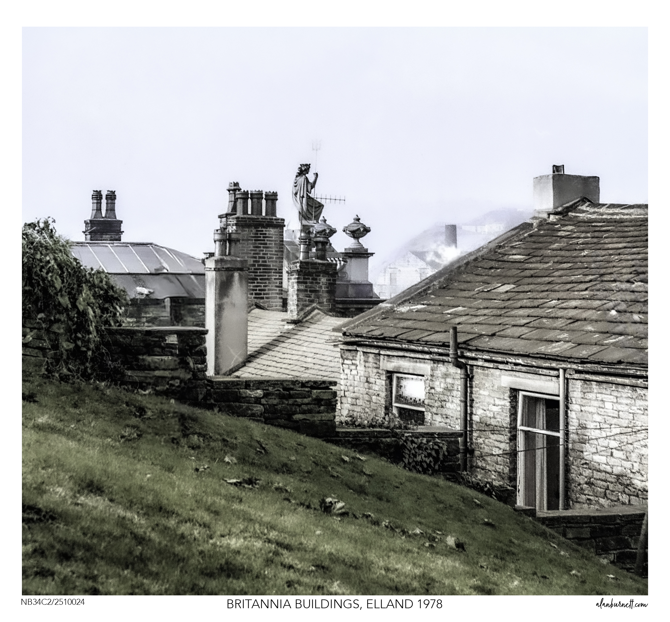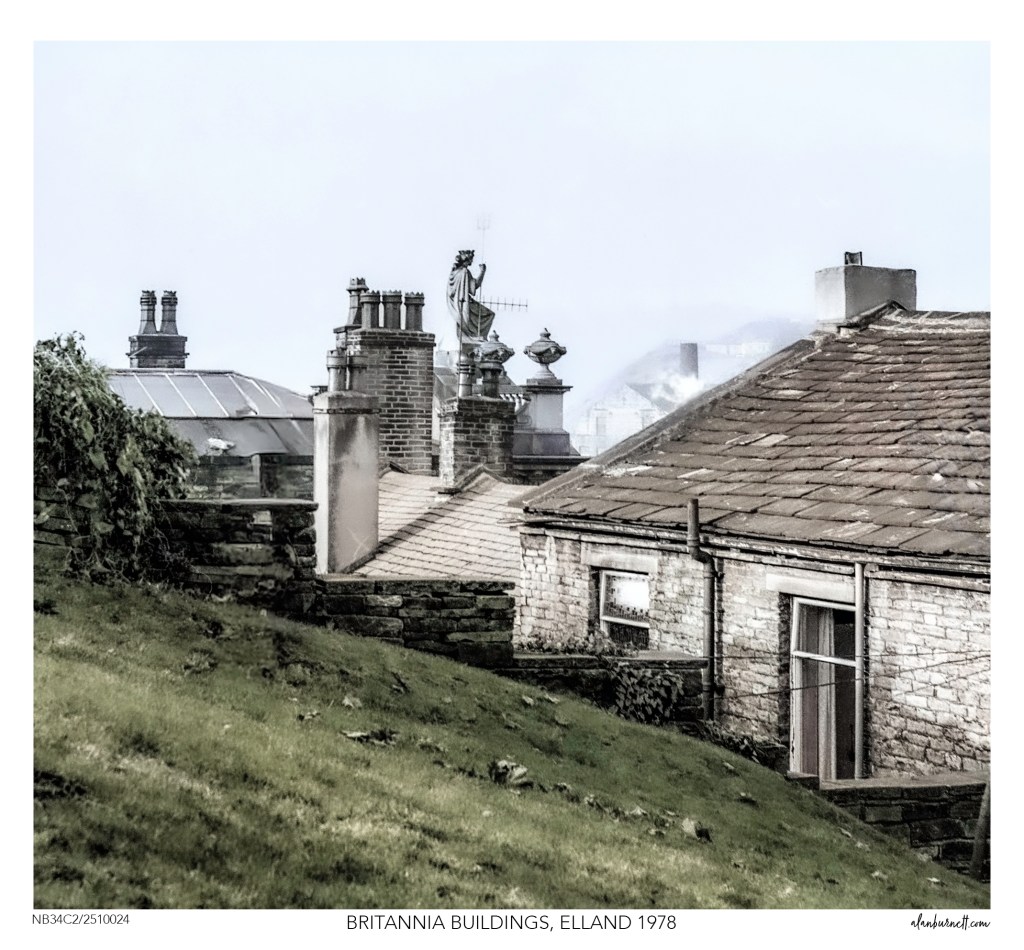 The industrial north has always excelled when it comes to contrasts: dark and light, green and grey, smoky chimneys and graceful statues. This photograph of mine is from the 1970s and shows the back of the Britannia Building, which stands at one end of Elland Bridge. Britannia sits aloft, holding a trident and a TV aerial.