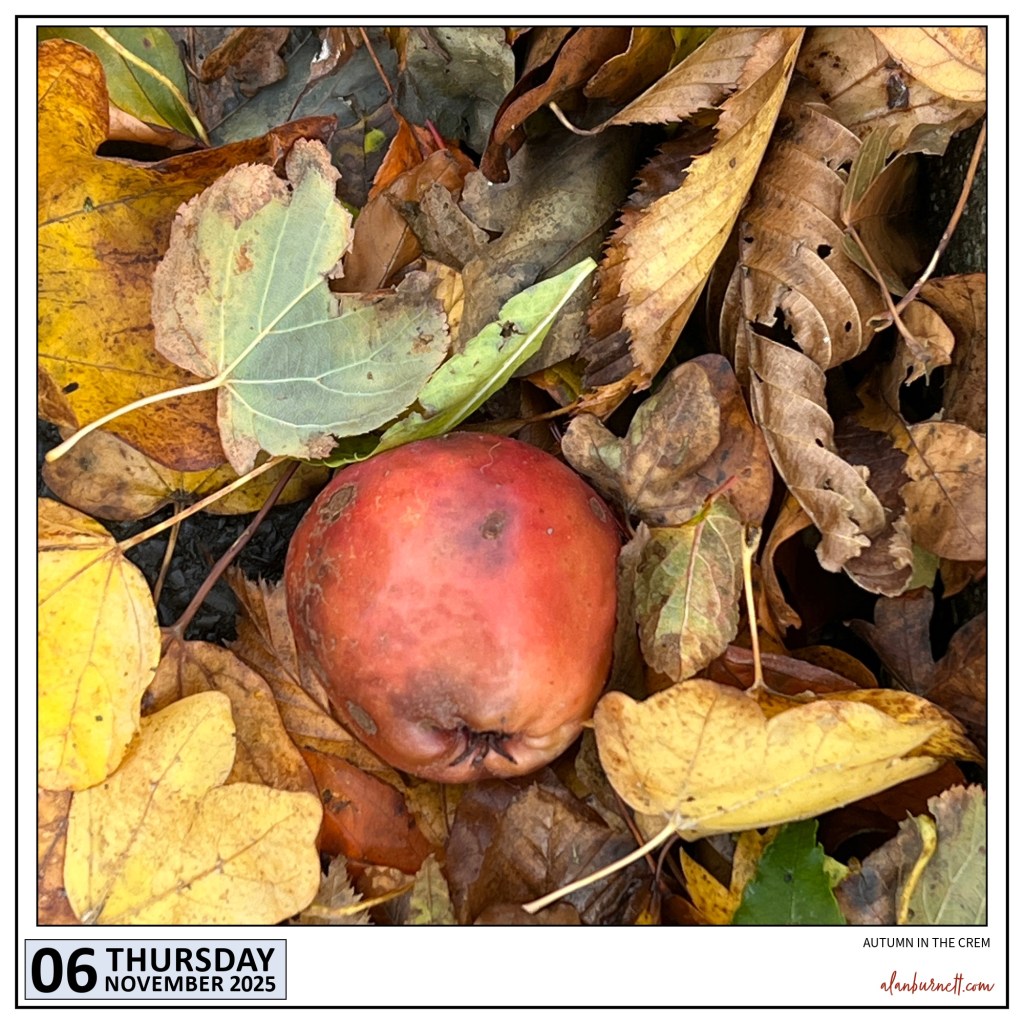 This little collage of Autumnal fruit and leaves was created by nothing other than gravity (not that I am suggesting that gravity is an insignificant force; it’s up there with love and malt whisky in my estimation). It featured in an exhibition held on the driveway of the local crematorium. Well worth a visit.