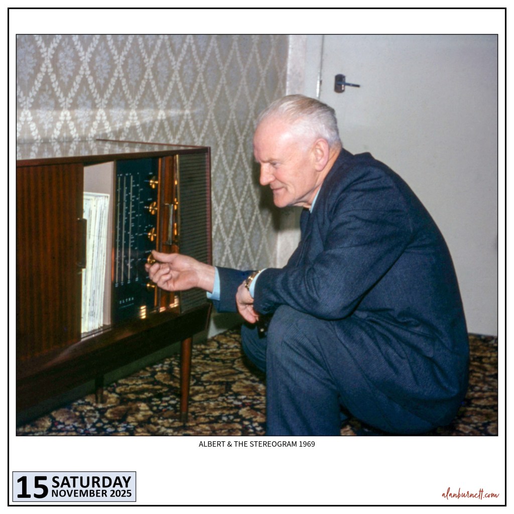 My father posed with one of his prized possessions – a radiogram (indeed a stereogram as it had two speakers). The radio would give you access to everything from the Light Programme to the Home Service, and even Radio Luxembourg on a clear evening. The record player had a select collection of LPs by Bing Crosby, Alma Cogan and the like. A few years later, he ripped the radio and record player out and converted it into a cocktail cabinet!