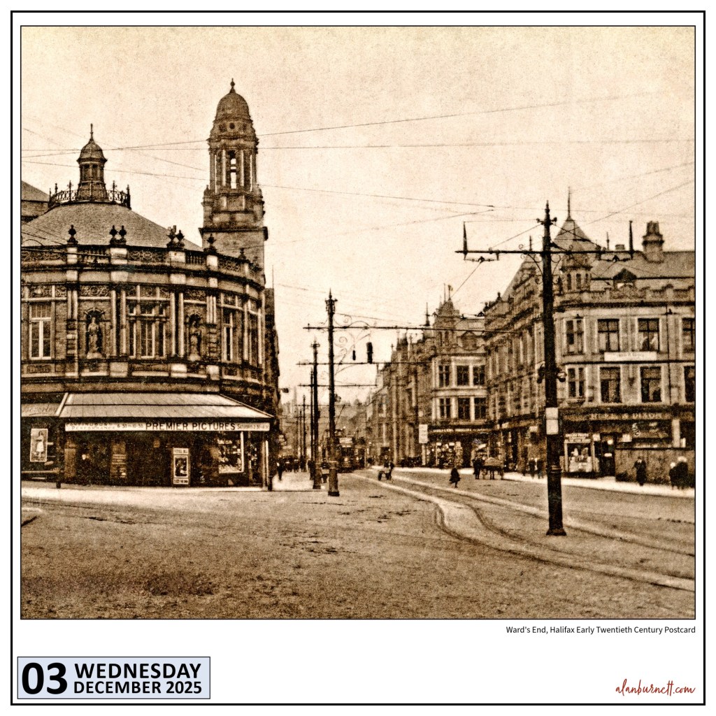 The raw shape of this scene is not all that different now to what it was when this postcard was first published more than a hundred years ago. Most of these buildings in this corner of Halifax are still in place: there’s more traffic these days, of course, and those elaborate tram poles are long gone. The photo must date from around 1910 when the Victoria Hall became, for a brief period, the home of Premier Pictures.