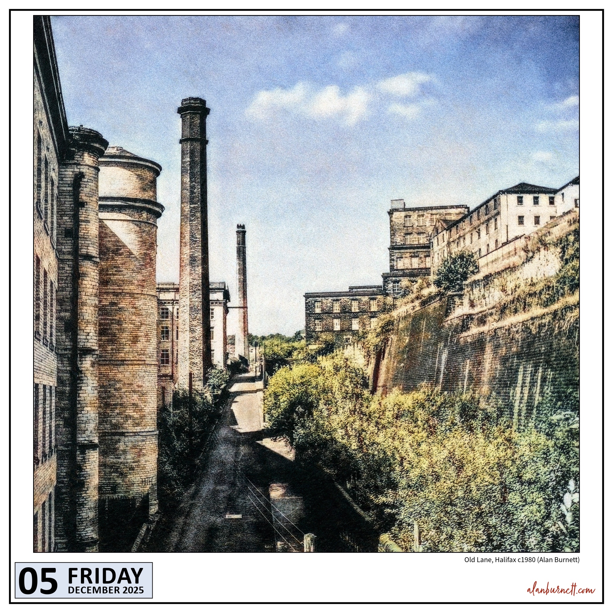 I suppose there were days when the sun shone and the sky had an Axminster Blue tint, times when the leaves were still green and the stone slabs looked like honeyed layers. But I still see the 1970s and 80s as black and white and fifty shades of rain-washed grey. I didn’t even have a coloured picture to illustrate this, so my original monochrome image has been tinted by an intelligence that is both artificial and has clearly never visited Halifax.
