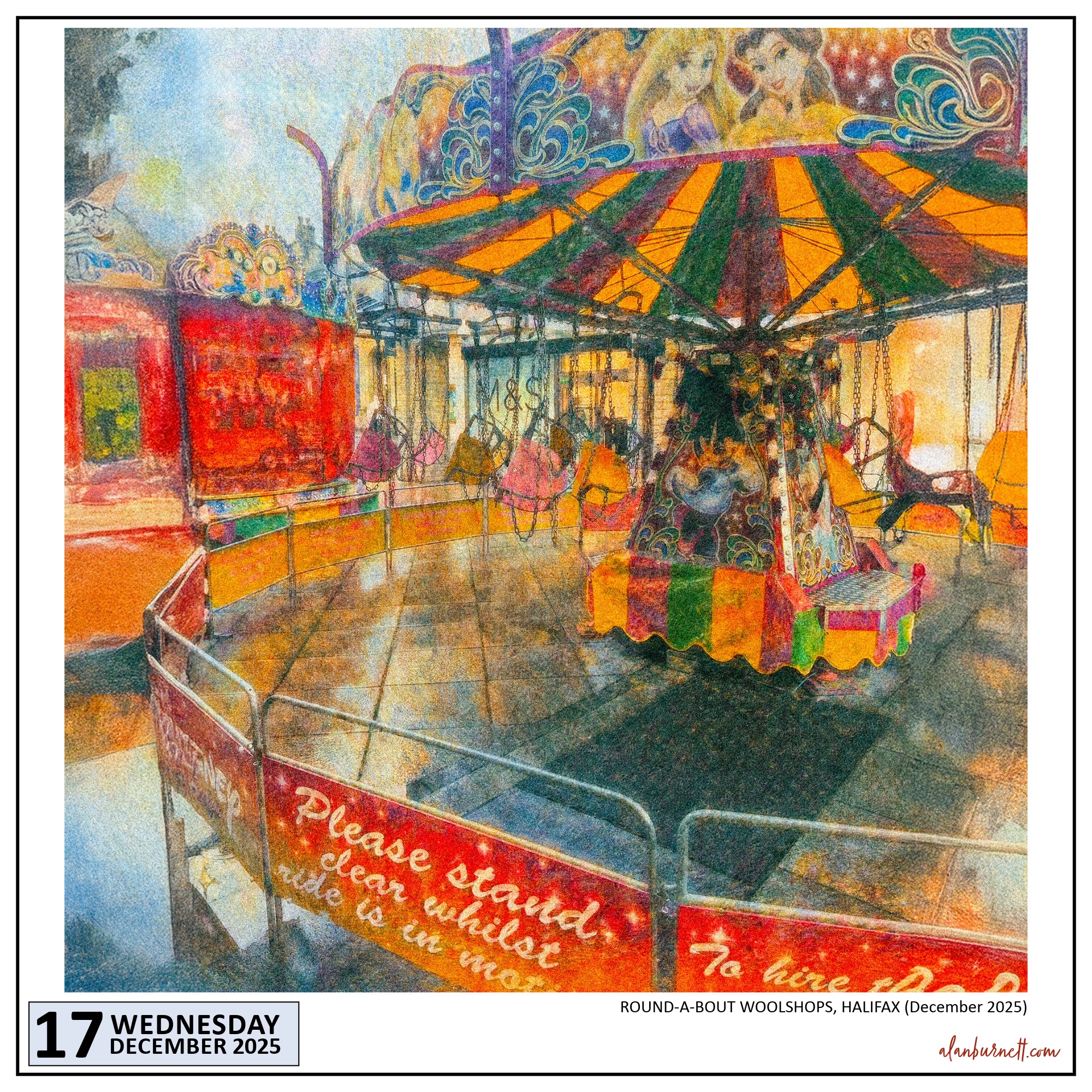 This is the children’s merry-go-round outside Marks and Spencer’s in Halifax. The rain was falling and the scene was sad, so I thought it could do with a little cheering up. Is it art, or is it AI kitsch? By the time I’d thought about it, the merry-go-round had gone round.