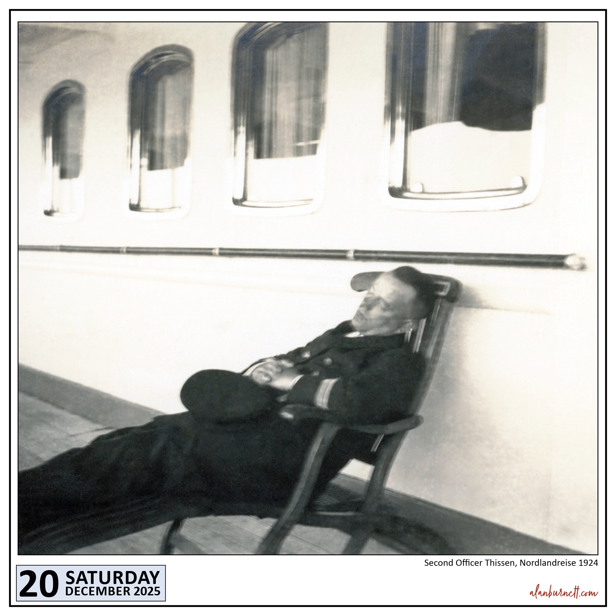 Today’s image comes from an album of 1920s photographs I acquired last year. The photographs seem to be German in origin – the captions are certainly in German – and they must at one time have been precious holiday photos. This particular photograph is from a North Sea cruise undertaken in 1924 and shows Second Officer Thissen who clearly is not the officer of the watch!