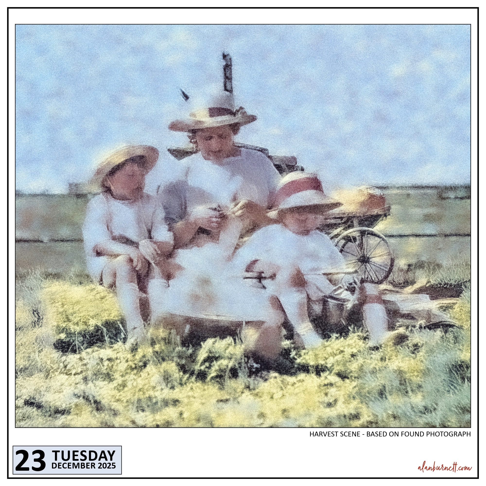The starting point for today’s image was a 1920s photograph from my suitcase full of “found photos.” It wasn’t in very good condition, so I felt at liberty to “mess around with it” (the digital scan, of course, not the original photograph). I rather like the result: nothing has been added, just the colours and the tones adjusted.