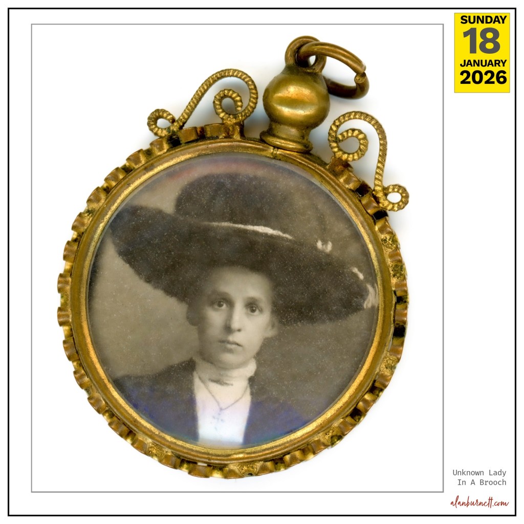 I found this old brooch whilst sorting through a box of “accumulatae” (not sure if that is a word, but if not, it should be). I assume that it has come from within the family, and therefore the rather charming lady in the large hat is a relative of mine. Precisely who she is, I have no idea, but I have pleasure in presenting her to the world. On the reverse of the brooch is another portrait. I will return to that, later.